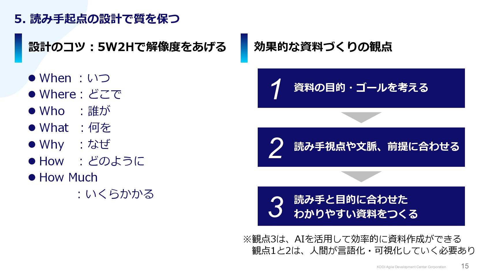 5. 読み⼿起点の設計で質を保つ KDDI Agile Development Center Corporation 15 設計のコツ︓5W2Hで解像度をあげる 効果的な資料づくりの観点