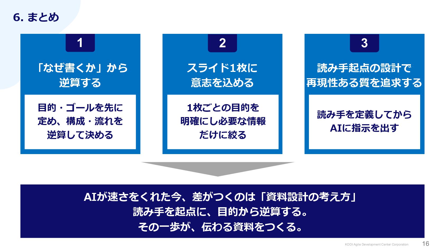 6. まとめ スライド1枚に 意志を込める 2 読み⼿起点の設計で 再現性ある質を追求する 3 「なぜ書くか」から 逆算する
