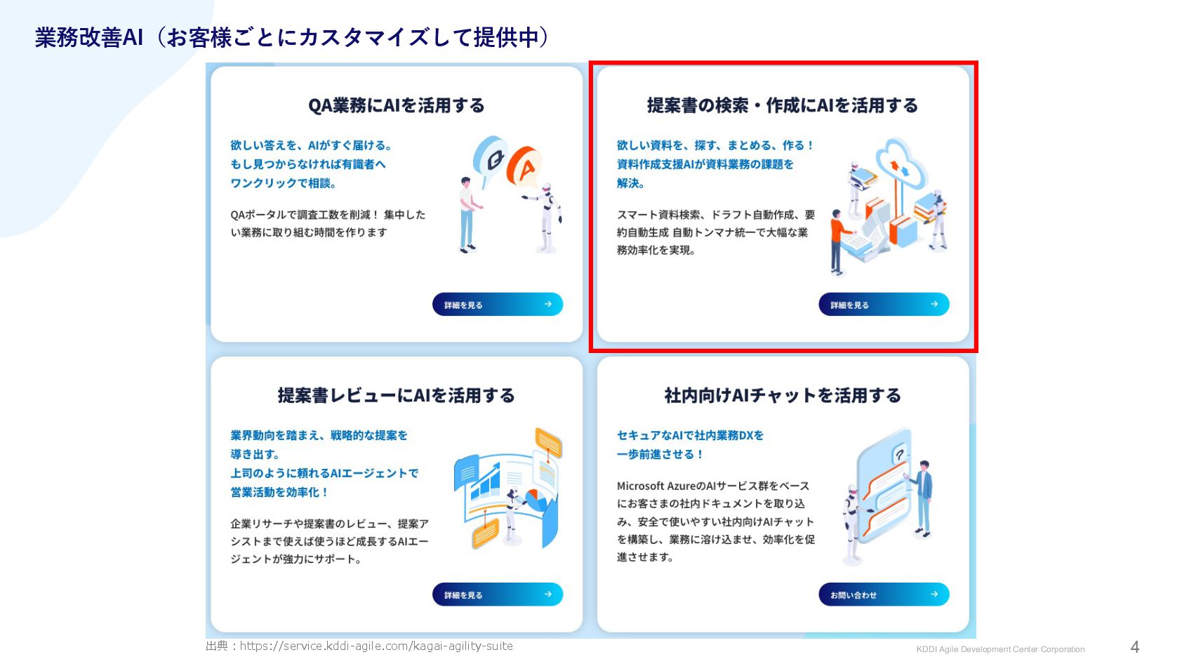 KDDI Agile Development Center Corporation お客様のニーズに応じ、AI活⽤を包括的に⽀援するサービス「KAGAI AGILITY Suite」を提供中 3 出典︓https://service.kddi-agile.com/kagai-agility-suite