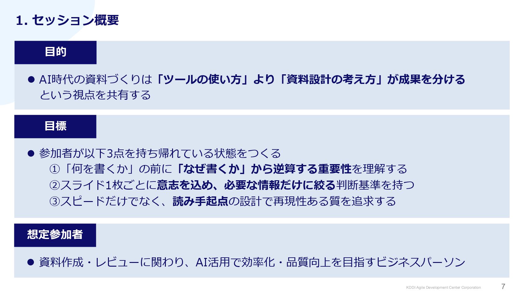 AI時代の資料づくりは「ツールの使い⽅」より「資料設計の考え⽅」が成果を分ける という視点を共有する ⽬標 l 参加者が以下3点を持ち帰れている状態をつくる ①「何を書くか」の前に「なぜ書くか」から逆算する重要性を理解する ②スライド1枚ごとに意志を込め、必要な情報だけに絞る判断基準を持つ ③スピードだけでなく、読み⼿起点の設計で再現性ある質を追求する 想定参加者 l 資料作成・レビューに関わり、AI活⽤で効率化・品質向上を⽬指すビジネスパーソン