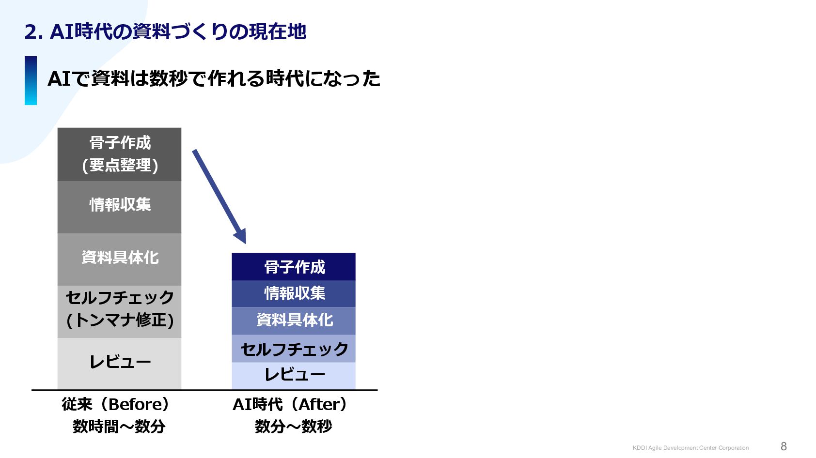 2. AI時代の資料づくりの現在地 KDDI Agile Development Center Corporation 8 従来(Before) 数時間〜数分