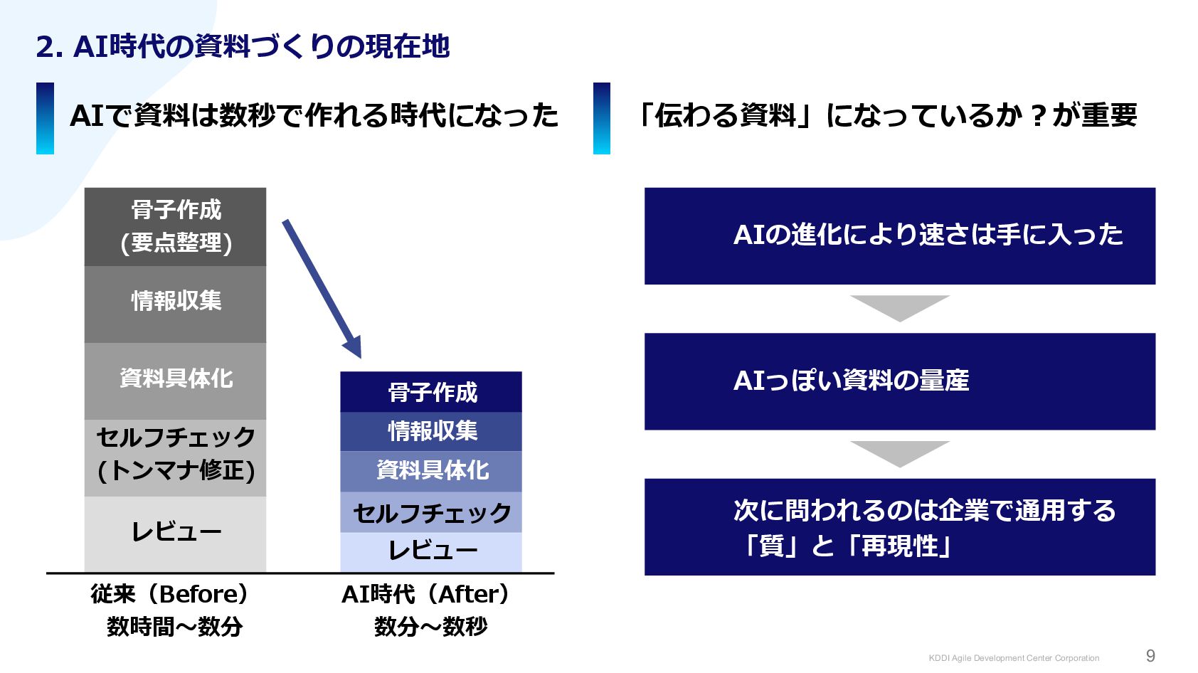 2. AI時代の資料づくりの現在地 KDDI Agile Development Center Corporation 9 従来(Before) 数時間〜数分