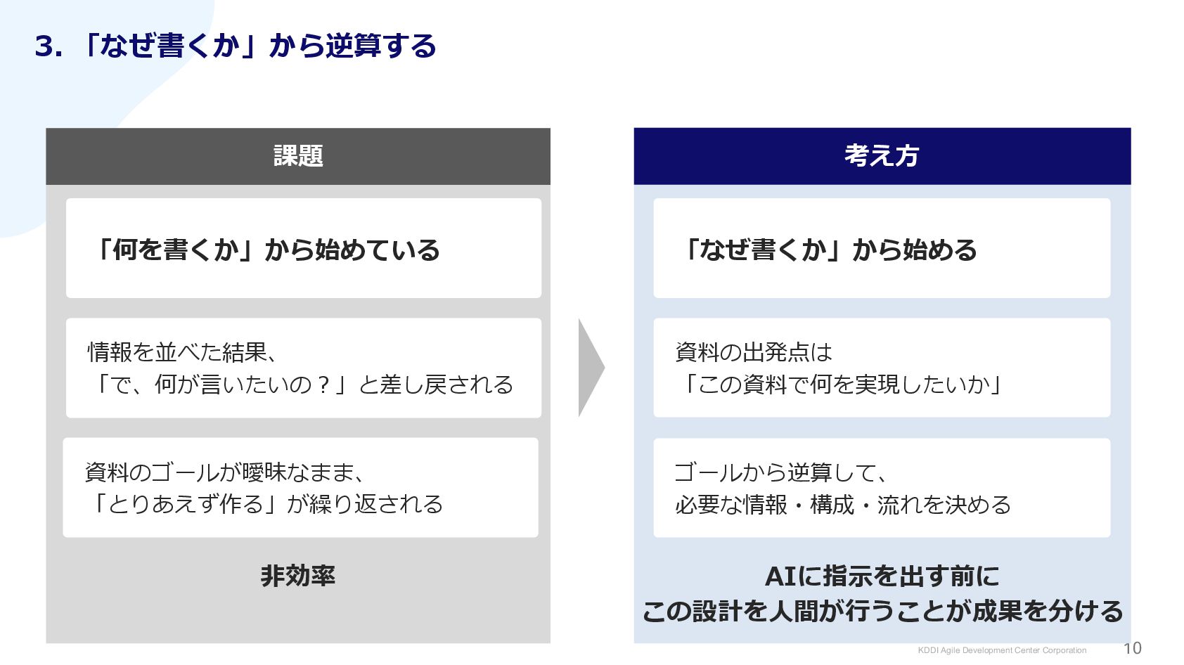 情報を並べた結果、 「で、何が⾔いたいの︖」と差し戻される ⾮効率 考え⽅ 「なぜ書くか」から始める 資料の出発点は 「この資料で何を実現したいか」 資料のゴールが曖昧なまま、 「とりあえず作る」が繰り返される ゴールから逆算して、 必要な情報・構成・流れを決める AIに指⽰を出す前に この設計を⼈間が⾏うことが成果を分ける