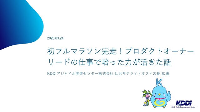 初フルマラソン完⾛!プロダクトオーナー リードの仕事で培った⼒が活きた話 2025.03.24 KDDIアジャイル開発センター株式会社 仙台サテライトオフィス⻑ 松浦