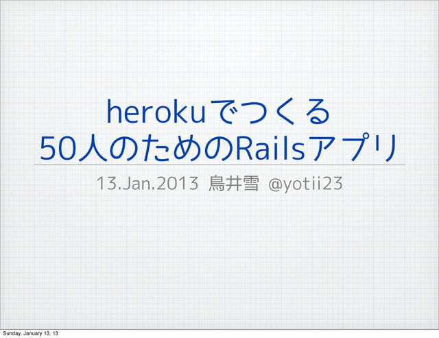 herokuでつくる 50人のためのRailsアプリ 13.Jan.2013 鳥井雪 @yotii23 Sunday, January 13, 13