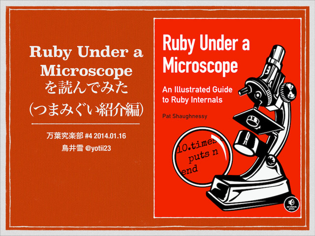 Executes Your CodeʢRubyͲ͏ͬͯ͜ͷίʔυΛ࣮ߦͯ͠Δͷ͔ʣ 4: Control Structures and Method Dispatch ʢ੍ޚߏͱ͔ϝιουݺͼग़͠ͱ͔ʣ 5: Objects and ClassesʢΦϒδΣΫτͱΫϥεɺͳɻ͋Εͳɻʣ 6: Method Lookup and Constant Lookup ʢϝιου୳ࡧͱఆ୳ࡧʣ 7: The Hash Table: The Workhorse of Ruby Internals ʢϋογϡςʔϒϧɺRuby෦ͷͨΒ͖Ϟϊʣ 8: How Ruby Borrowed a Decades-Old Idea from Lisp ʢϒϩοΫRubyಠࣗͷಛͱ͔͡ΌͶ͔͑Βʂʣ 9: Metaprogramming ʢࠇຐज़ʣ 10: JRuby: Ruby on the JVM ʢJVMʣ, 11: Rubinius: Ruby Implemented with Ruby ʢRubiniusʣ 12: Garbage Collection in MRI, JRuby, and Rubinius ʢॲཧܥʹΑΔGC͍Ζ͍Ζʣ ࣍ͬ͟ͱݟ