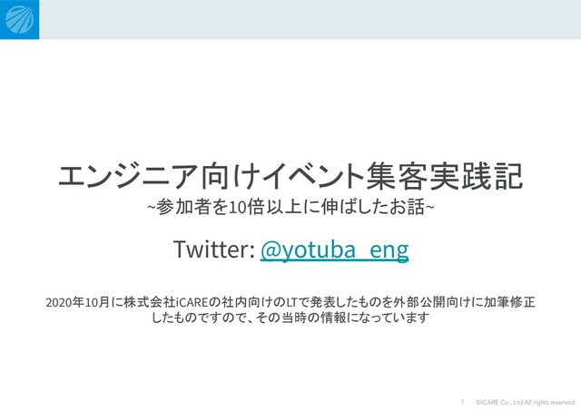 エンジニア向けイベント集客実践記 株式会社iCAREの外部向けエンジニアテックイベント iCARE Dev Meetup(https://icare.connpass.com/) の参加者をどう増やしていったかを実体験をもとに記述した資料です。