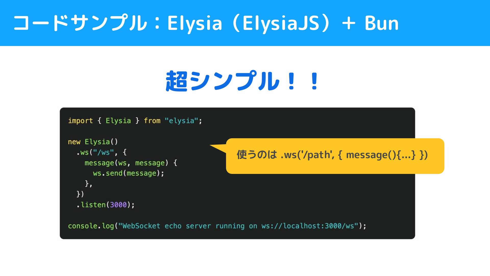 コードサンプル:Elysia(ElysiaJS)+ Bun 使うのは .ws('/path', { message(){...} }) 超シンプル!!