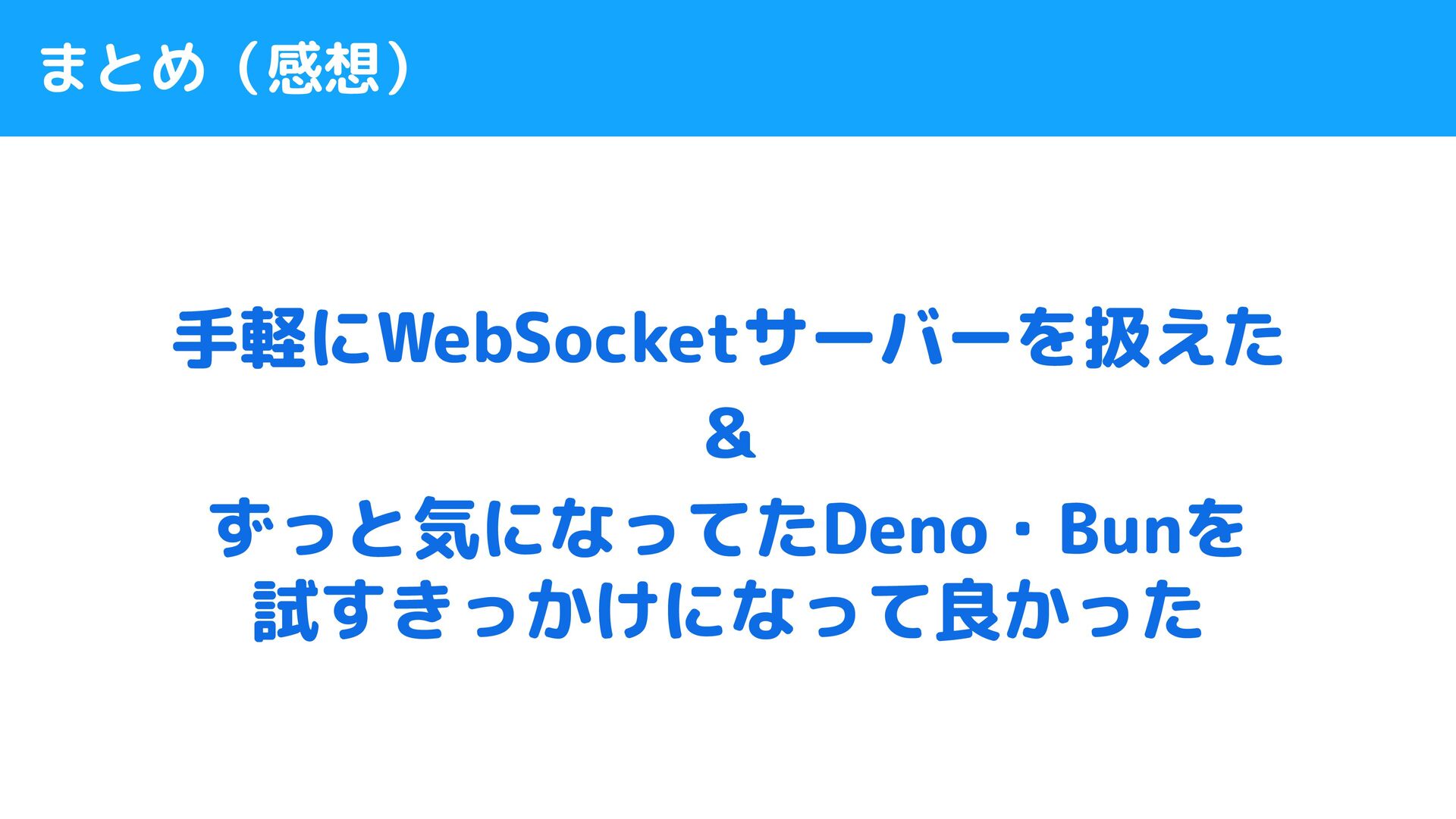 まとめ(感想) 手軽にWebSocketサーバーを扱えた & ずっと気になってたDeno・Bunを 試すきっかけになって良かった