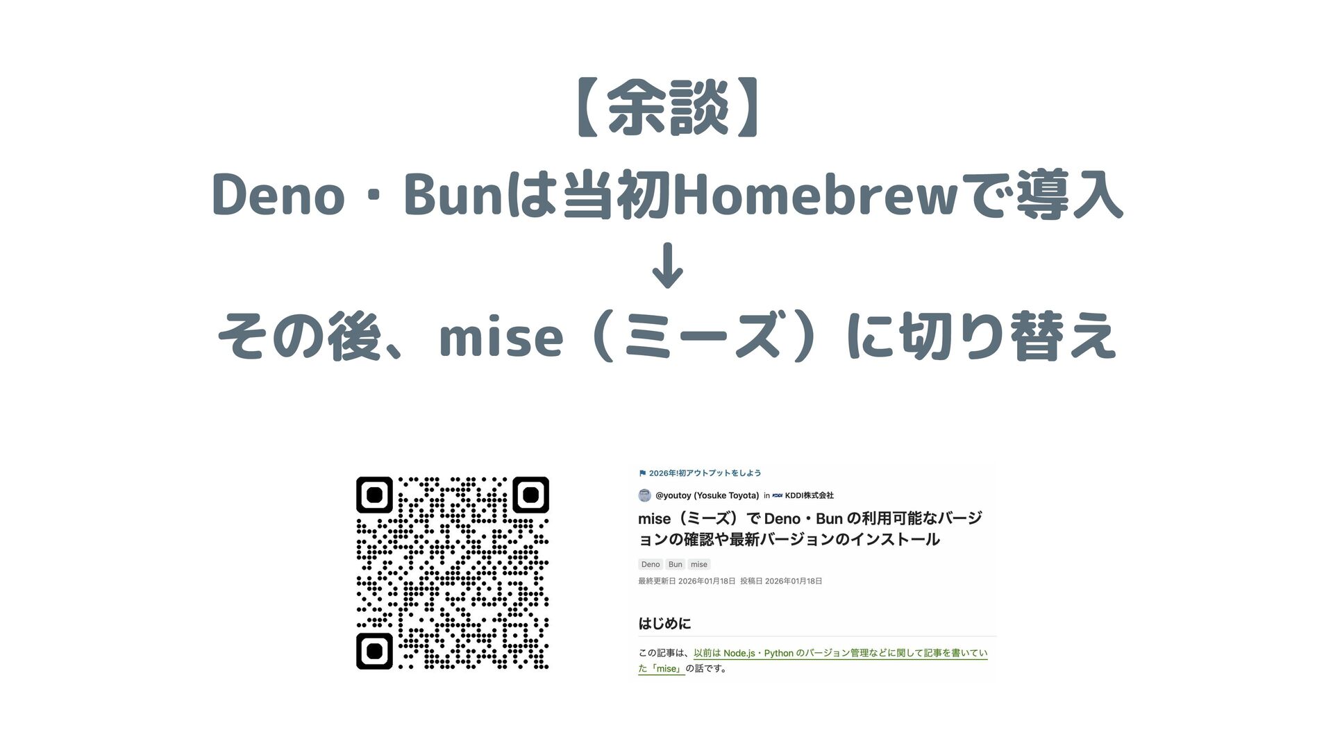 【余談】 Deno・Bunは当初Homebrewで導入 ↓ その後、mise(ミーズ)に切り替え