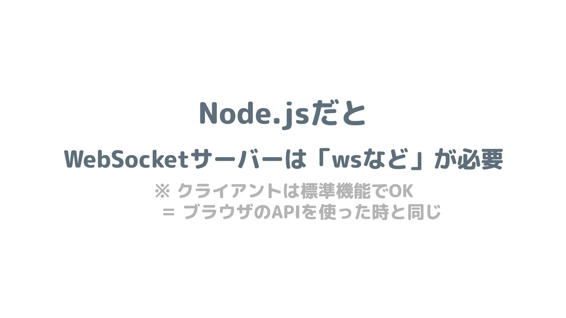 Node.jsだと WebSocketサーバーは「wsなど」が必要 ※ クライアントは標準機能でOK = ブラウザのAPIを使った時と同じ