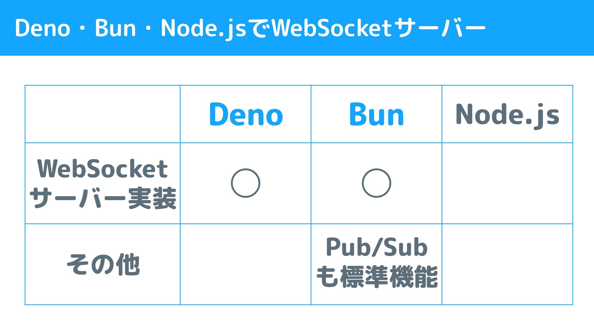Deno・Bun・Node.jsでWebSocketサーバー Deno Bun Node.js WebSocket サーバー実装 ◯ ◯ その他 Pub/Sub