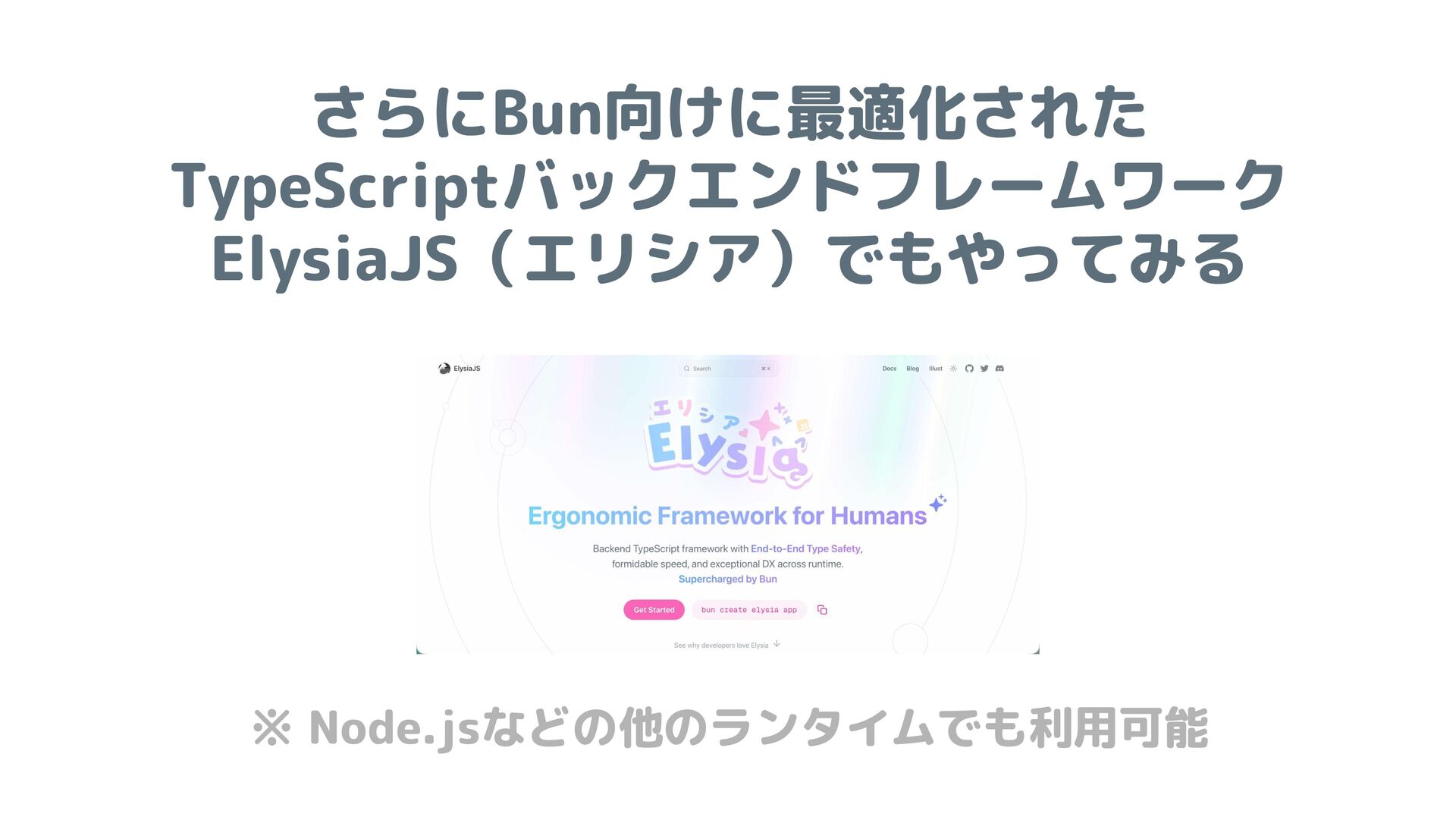 さらにBun向けに最適化された TypeScriptバックエンドフレームワーク ElysiaJS(エリシア)でもやってみる ※ Node.jsなどの他のランタイムでも利用可能