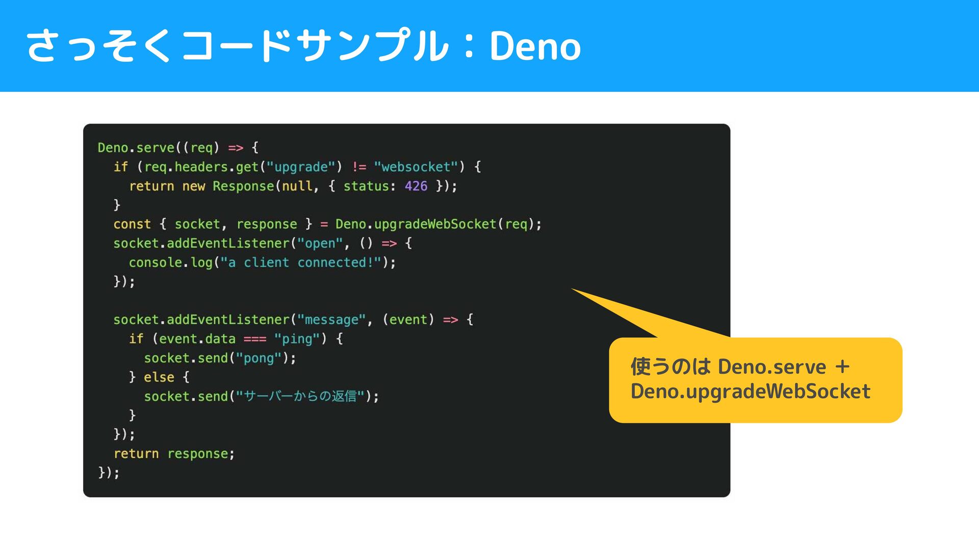 さっそくコードサンプル:Deno 使うのは Deno.serve + Deno.upgradeWebSocket