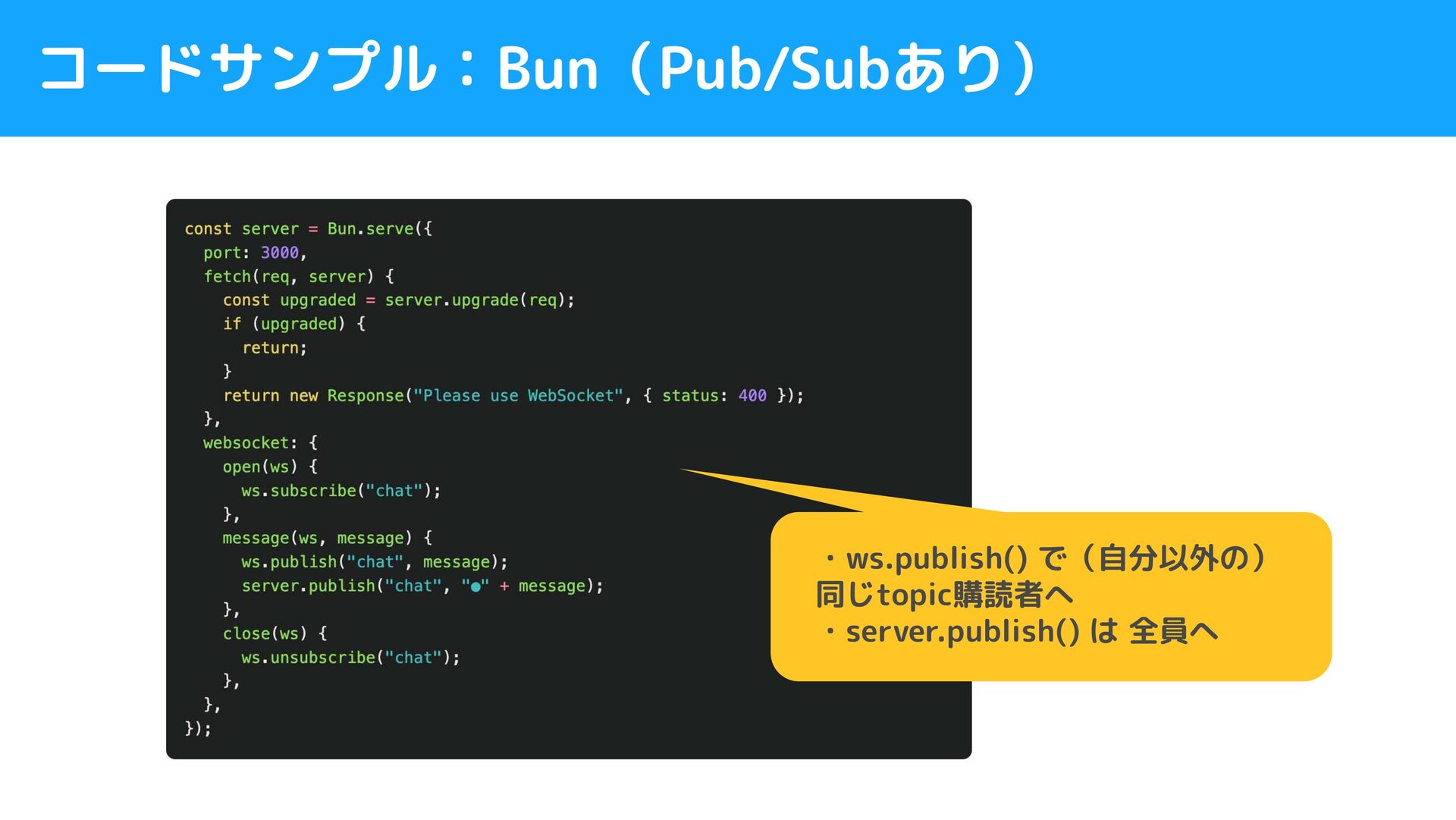コードサンプル:Bun(Pub/Subあり) ・ws.publish() で(自分以外の) 同じtopic購読者へ ・server.publish() は 全員へ