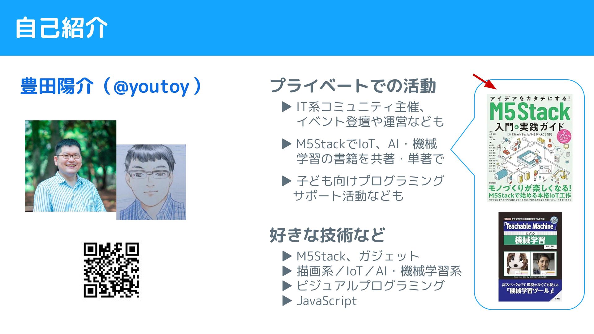 自己紹介 豊田陽介( ) @youtoy ▶ IT系コミュニティ主催、 イベント登壇や運営なども ▶ M5StackでIoT、AI・機械