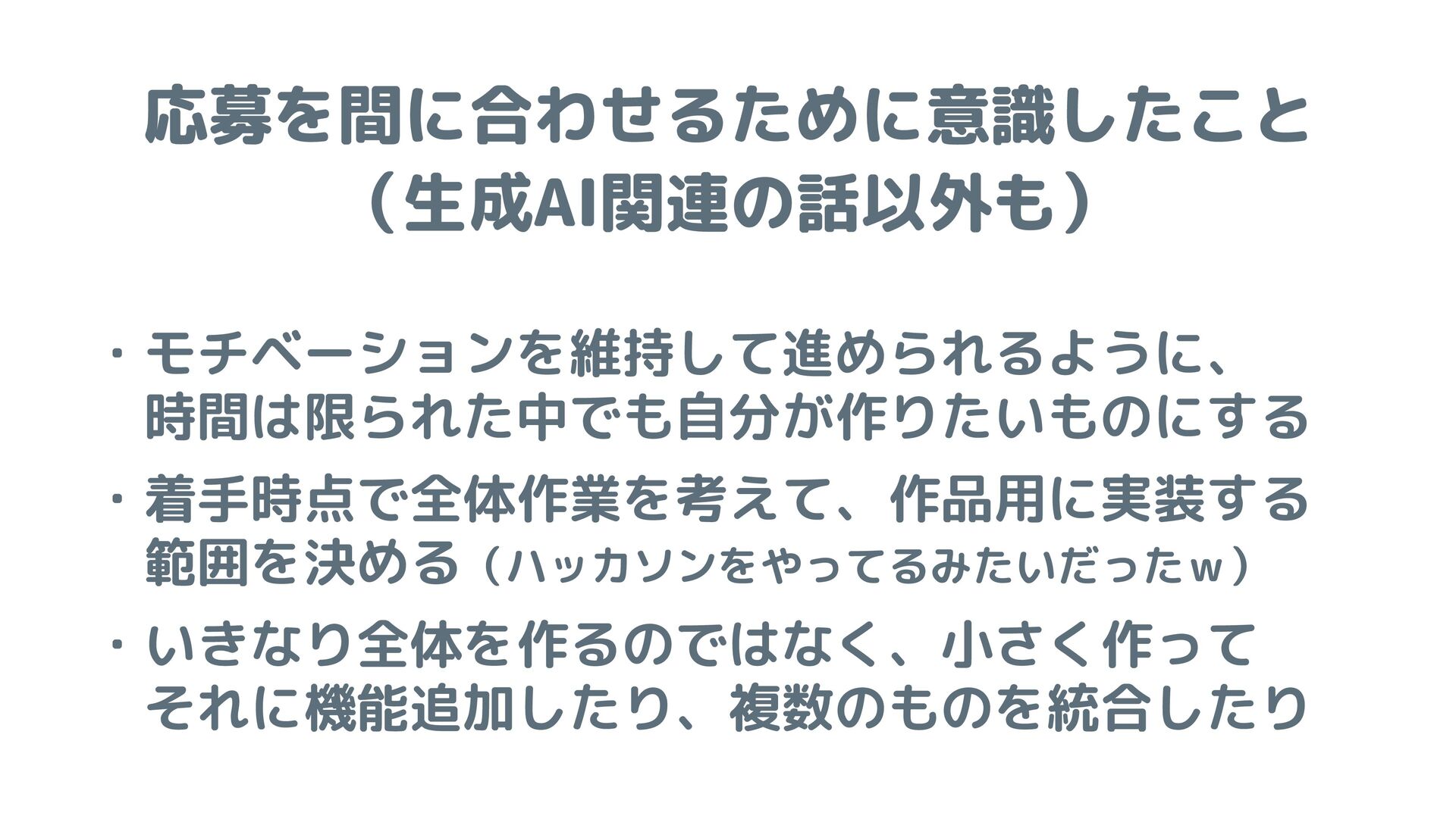応募を間に合わせるために意識したこと (生成AI関連の話以外も) ・モチベーションを維持して進められるように、 時間は限られた中でも自分が作りたいものにする ・着手時点で全体作業を考えて、作品用に実装する 範囲を決める(ハッカソンをやってるみたいだったw) ・いきなり全体を作るのではなく、小さく作って それに機能追加したり、複数のものを統合したり