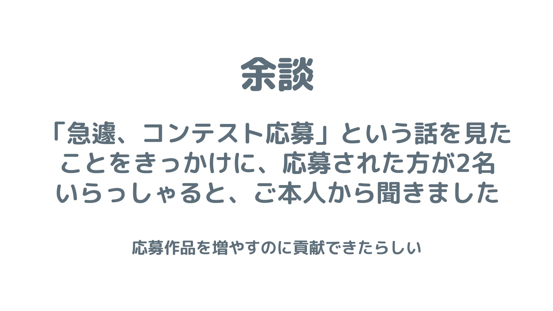 余談 「急遽、コンテスト応募」という話を見た ことをきっかけに、応募された方が2名 いらっしゃると、ご本人から聞きました 応募作品を増やすのに貢献できたらしい