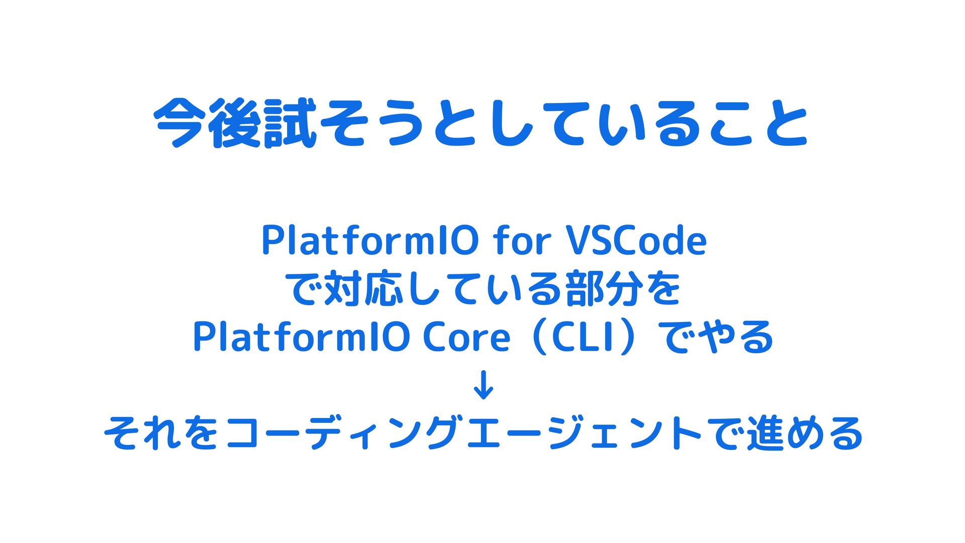 今後試そうとしていること PlatformIO for VSCode で対応している部分を PlatformIO Core(CLI)でやる ↓ それをコーディングエージェントで進める