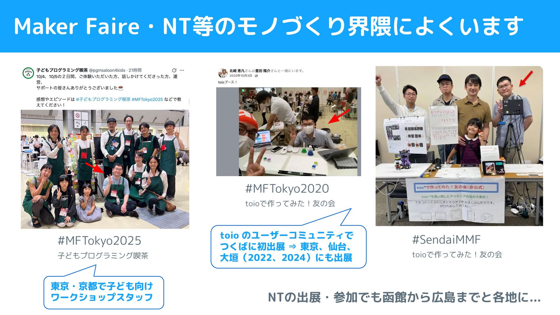 Maker Faire・NT等のモノづくり界隈によくいます #MFTokyo2020 toioで作ってみた!友の会 #MFTokyo2025 子どもプログラミング喫茶 東京・京都で子ども向け ワークショップスタッフ toio のユーザーコミュニティで