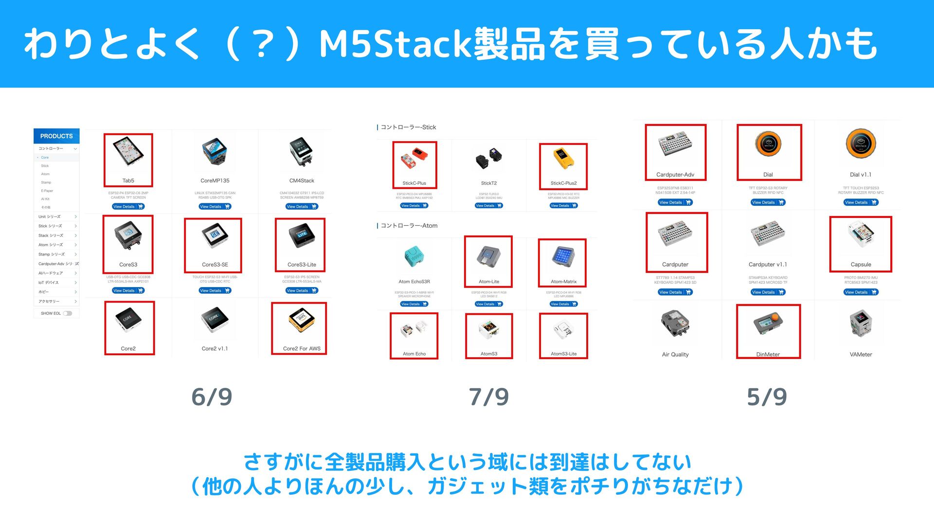 わりとよく(?)M5Stack製品を買っている人かも 6/9 7/9 5/9 さすがに全製品購入という域には到達はしてない (他の人よりほんの少し、ガジェット類をポチりがちなだけ)