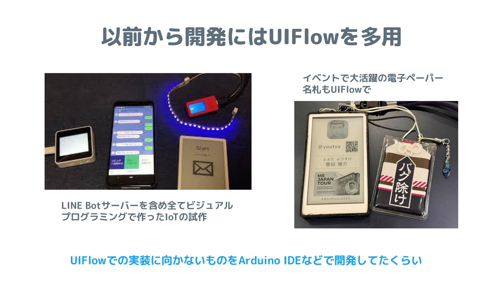 以前から開発にはUIFlowを多用 LINE Botサーバーを含め全てビジュアル プログラミングで作ったIoTの試作 イベントで大活躍の電子ペーパー 名札もUIFlowで UIFlowでの実装に向かないものをArduino IDEなどで開発してたくらい