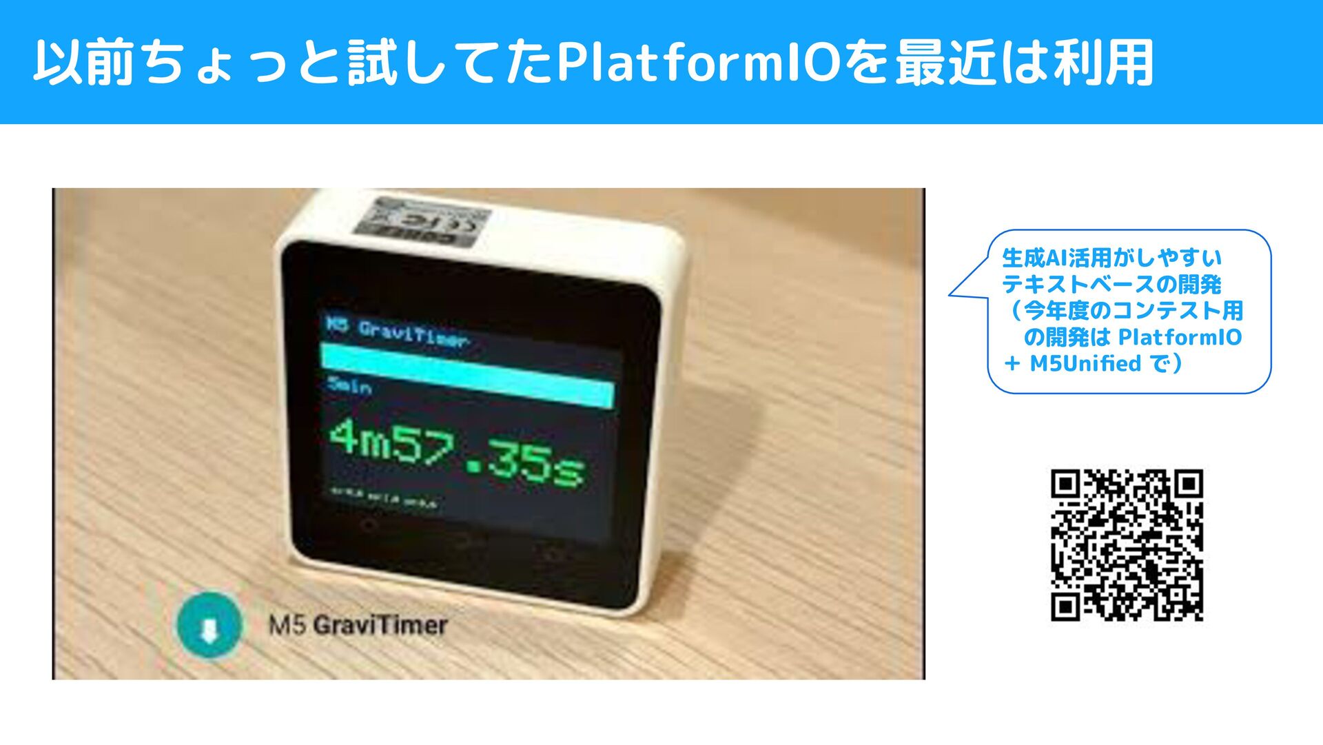 以前ちょっと試してたPlatformIOを最近は利用 生成AI活用がしやすい テキストベースの開発 (今年度のコンテスト用 の開発は PlatformIO + M5Unified で)