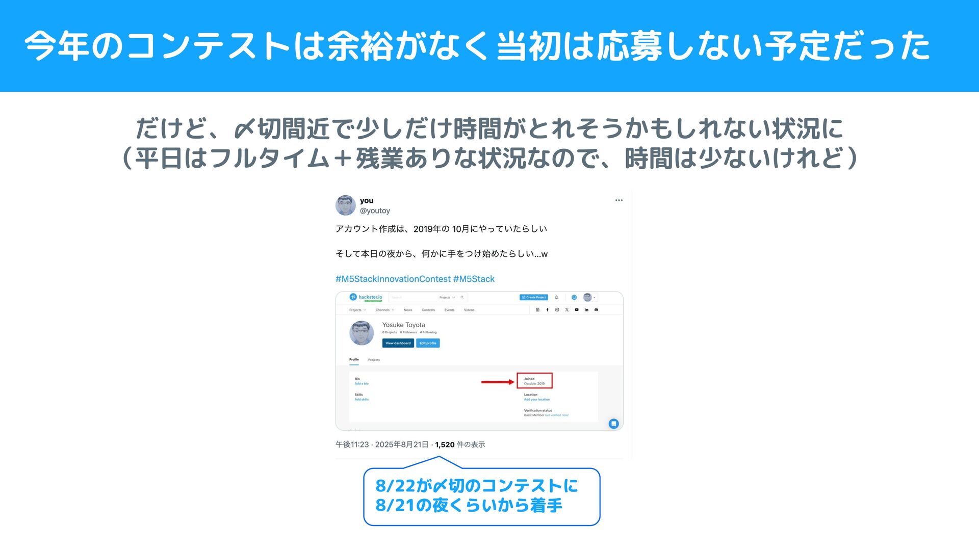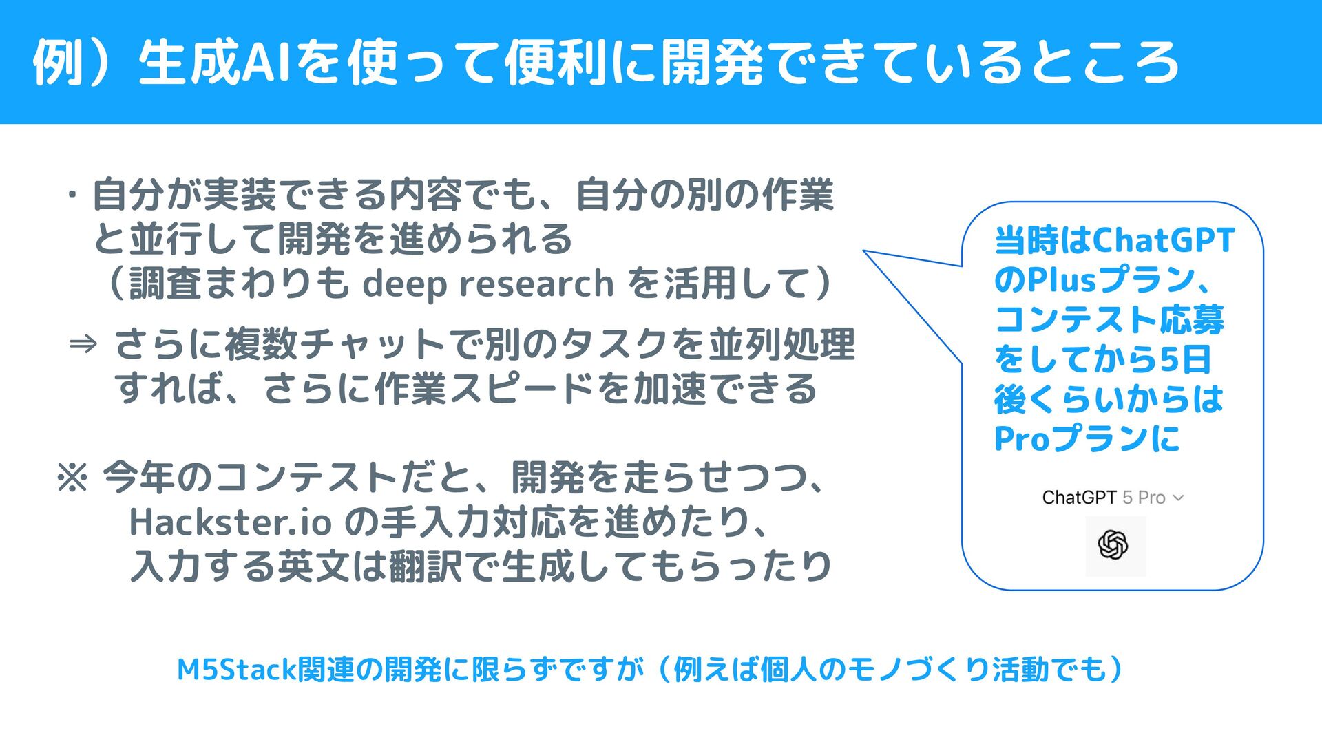 ※ 今年のコンテストだと、開発を走らせつつ、 Hackster.io の手入力対応を進めたり、 入力する英文は翻訳で生成してもらったり 当時はChatGPT のPlusプラン、 コンテスト応募 をしてから5日 後くらいからは Proプランに M5Stack関連の開発に限らずですが(例えば個人のモノづくり活動でも)