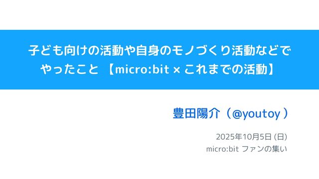 2025年10月5日 (日) micro:bit ファンの集い 豊田陽介( ) @youtoy 子ども向けの活動や自身のモノづくり活動などで やったこと 【micro:bit