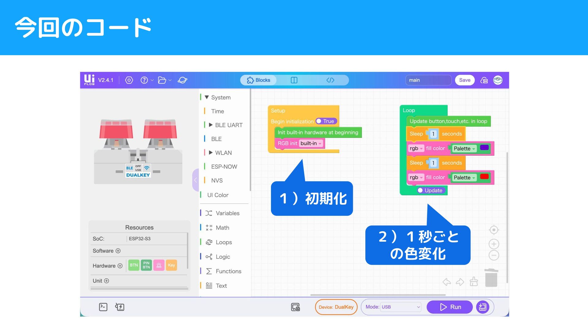 今回のコード 1)初期化 2)1秒ごと の色変化