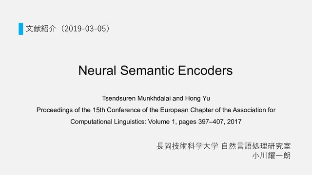 長岡技術科学大学 自然言語処理研究室 文献紹介(2019-03-05) Neural Semantic Encoders http://www.aclweb.org/anthology/E17-1038