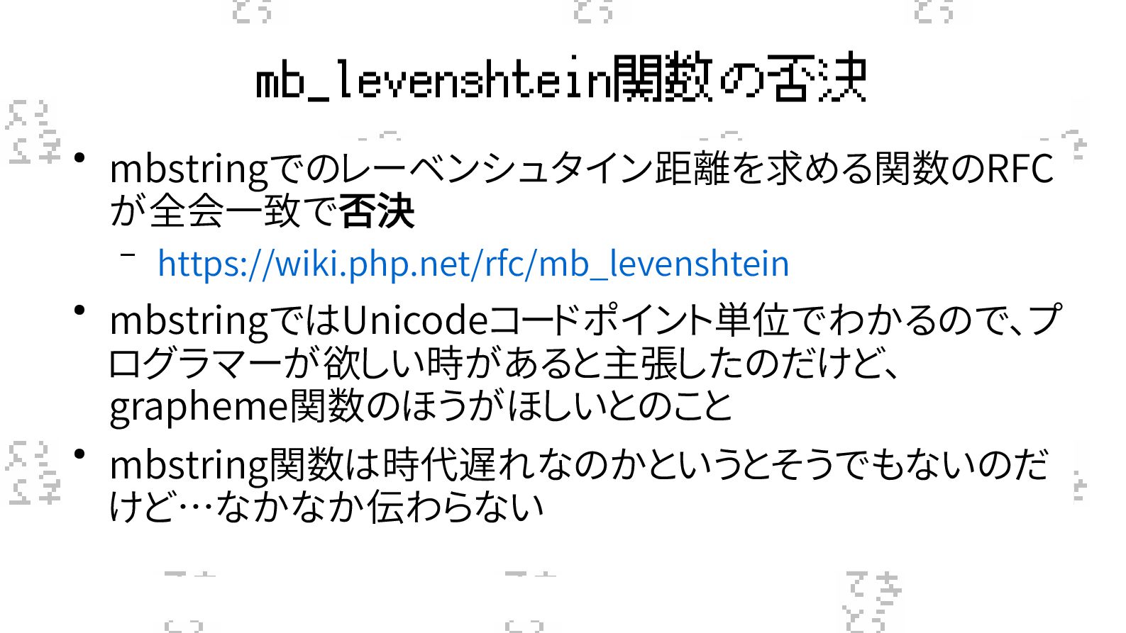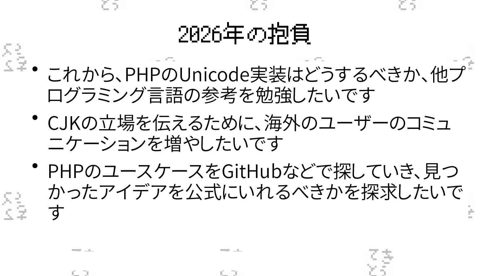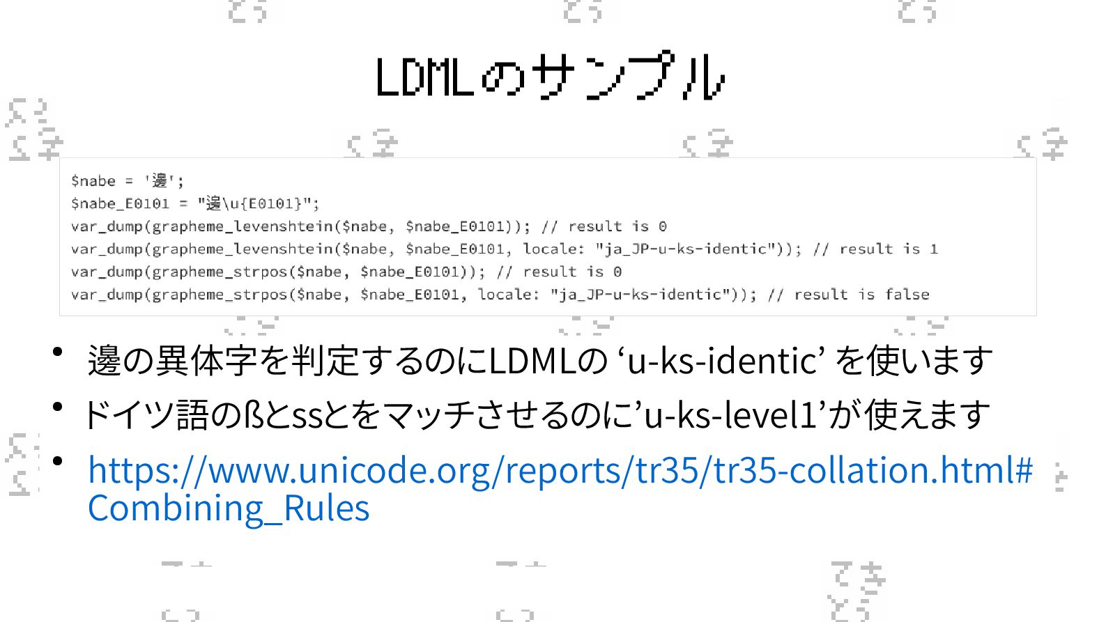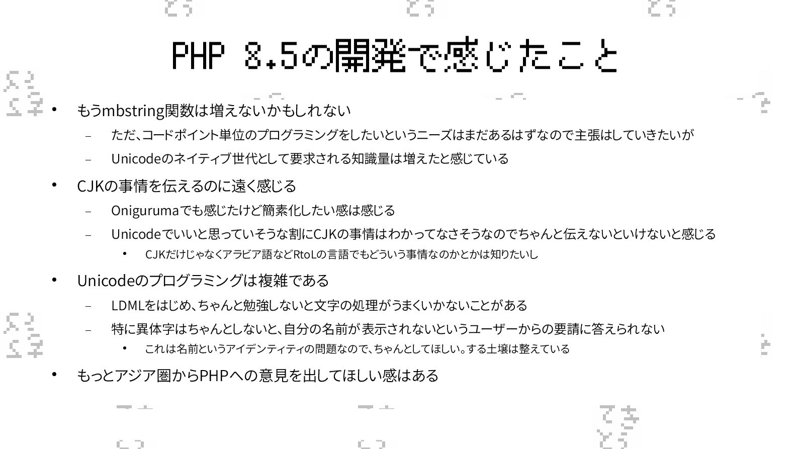 – Onigurumaでも感じたけど簡素化したい感は感じる – Unicodeでいいと思っていそうな割にCJKの事情はわかってなさそうなのでちゃんと伝えないといけないと感じる • CJKだけじゃなくアラビア語などRtoLの言語でもどういう事情なのかとかは知りたいし • Unicodeのプログラミングは複雑である – LDMLをはじめ、ちゃんと勉強しないと文字の処理がうまくいかないことがある – 特に異体字はちゃんとしないと、自分の名前が表示されないというユーザーからの要請に答えられない • これは名前というアイデンティティの問題なので、ちゃんとしてほしい。する土壌は整えている • もっとアジア圏からPHPへの意見を出してほしい感はある