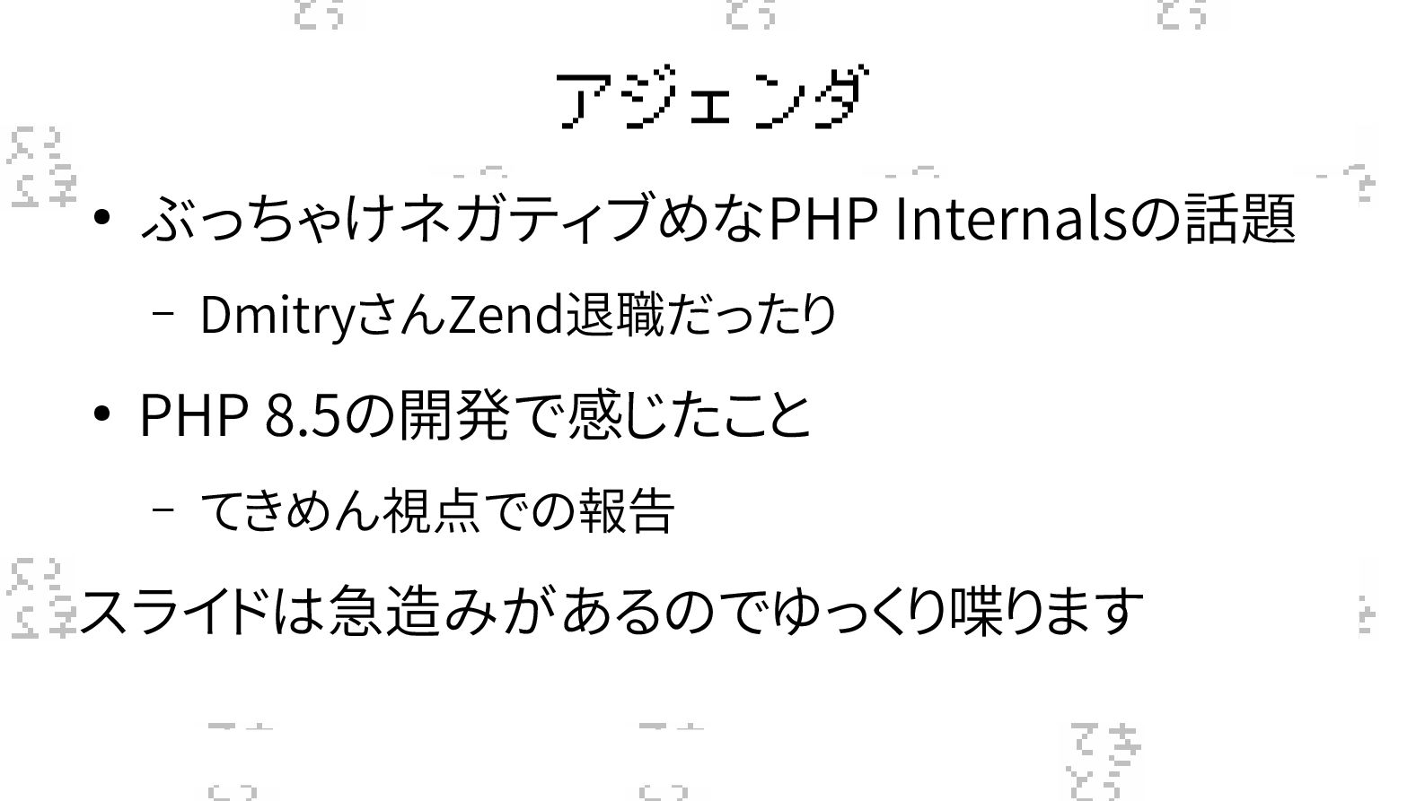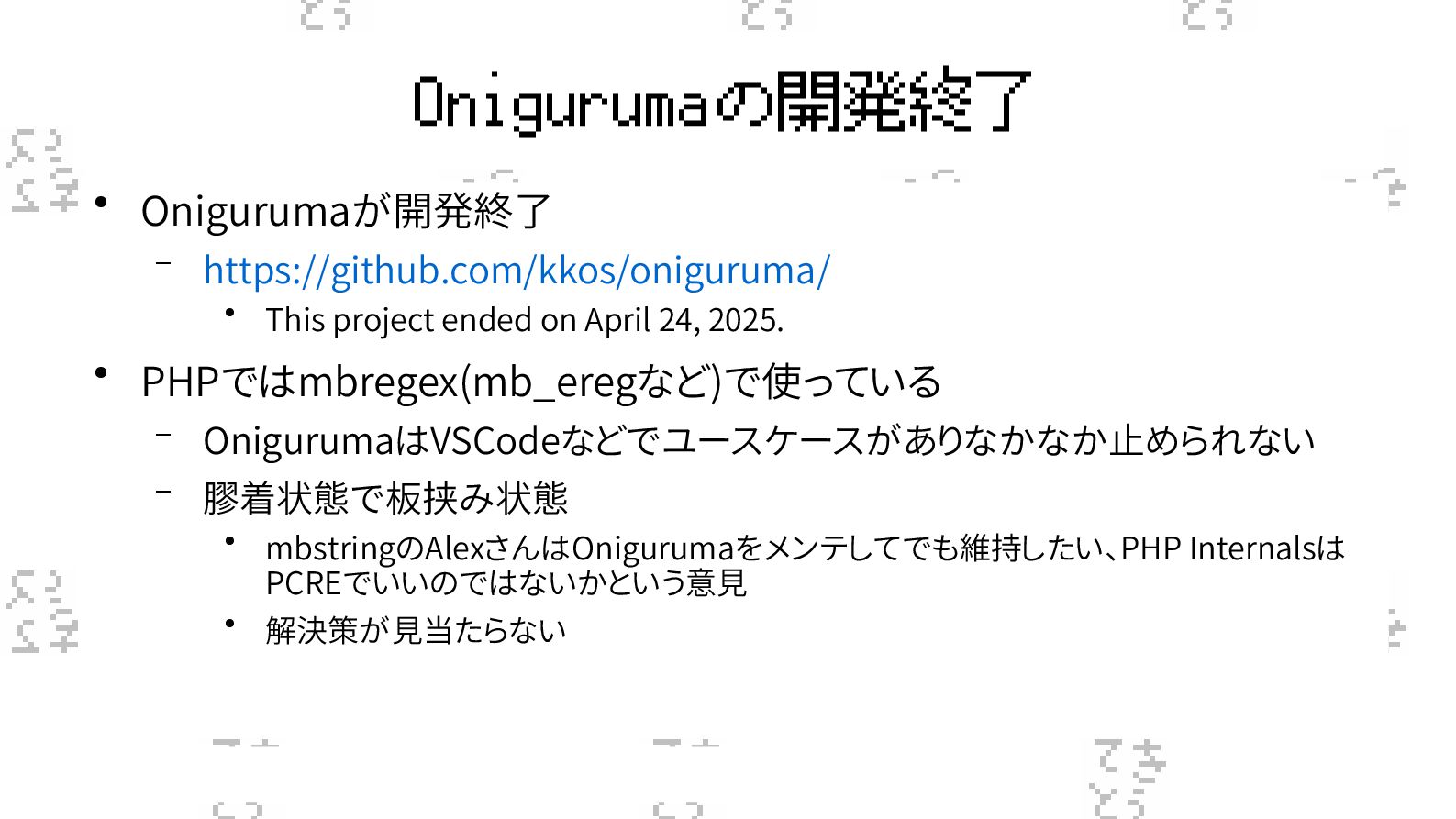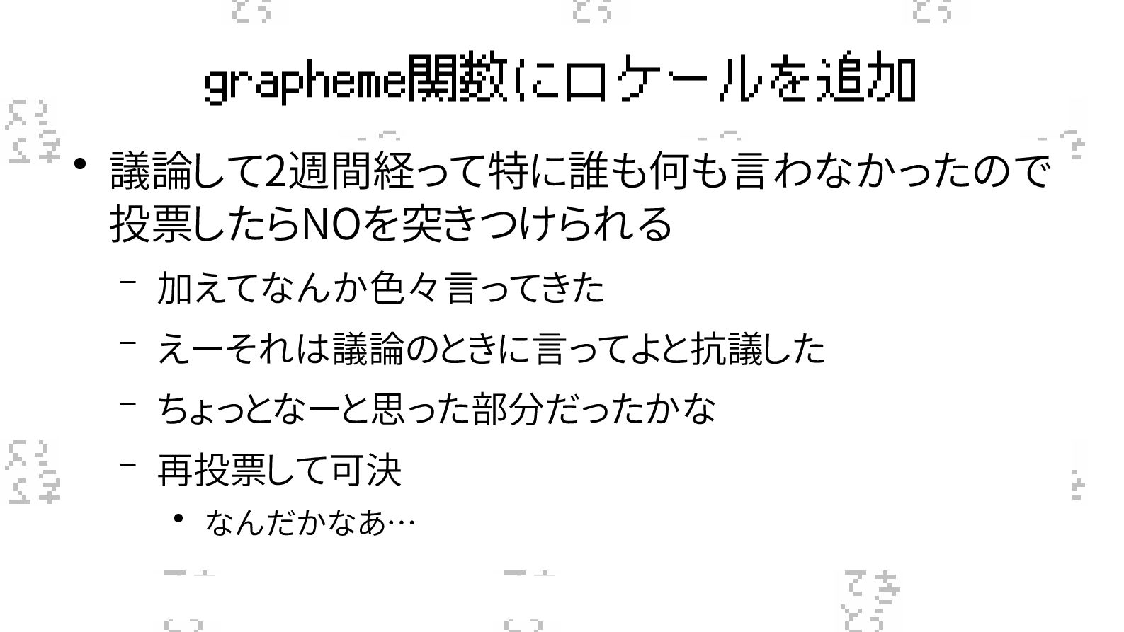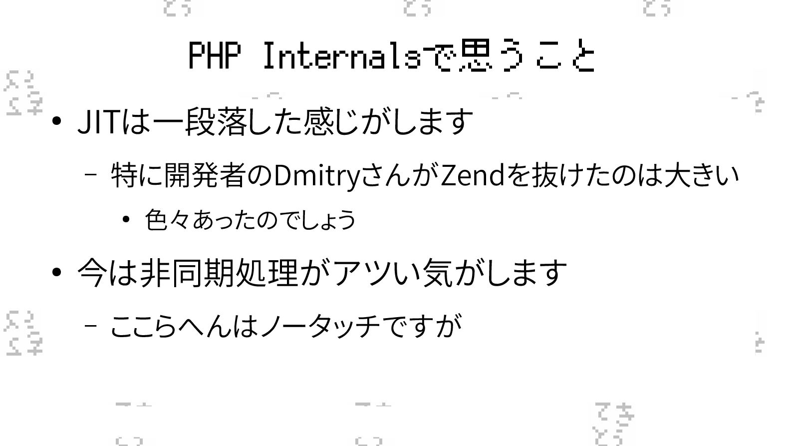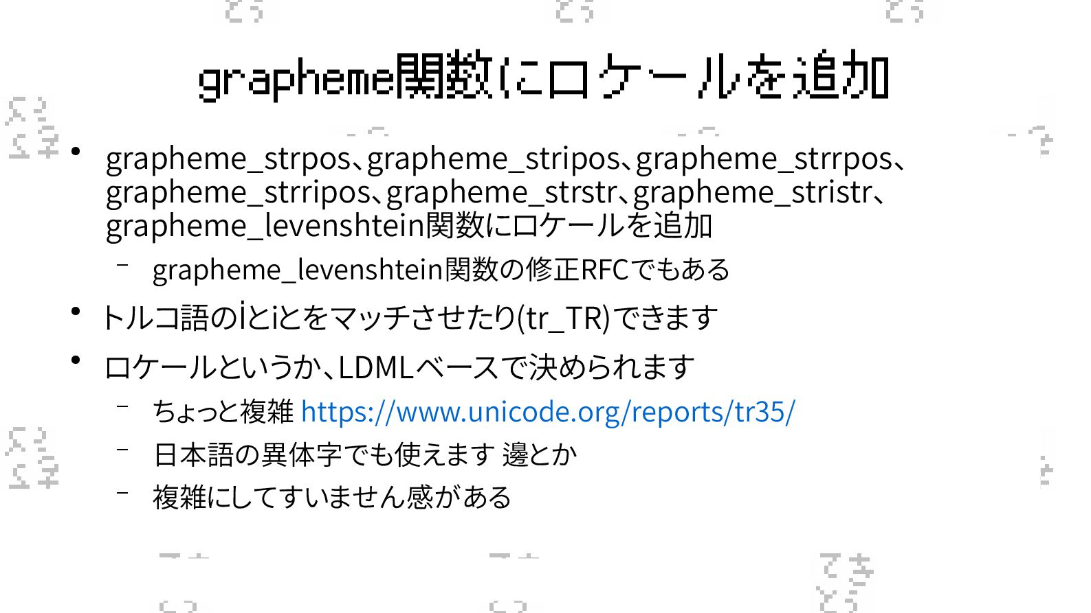 – Onigurumaでも感じたけど簡素化したい感は感じる – Unicodeでいいと思っていそうな割にCJKの事情はわかってなさそうなのでちゃんと伝えないといけないと感じる • CJKだけじゃなくアラビア語などRtoLの言語でもどういう事情なのかとかは知りたいし • Unicodeのプログラミングは複雑である – LDMLをはじめ、ちゃんと勉強しないと文字の処理がうまくいかないことがある – 特に異体字はちゃんとしないと、自分の名前が表示されないというユーザーからの要請に答えられない • これは名前というアイデンティティの問題なので、ちゃんとしてほしい。する土壌は整えている • もっとアジア圏からPHPへの意見を出してほしい感はある