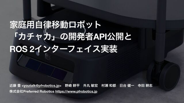 スマートファニチャープラットフォーム「カチャカ」はPreferred Roboticsが販売中の家庭用自律移動ロボットです。独自の深層学習、ナビゲーション、SLAMなどの技術をコンパクトなボディに内蔵しています。今回、近日提供予定の開発者向けAPIとそのAPIを使ったROS 2インターフェイス実装を紹介します。カチャカは家庭用途だけでなく、教育、産業用途にも適用範囲を拡大していきます。