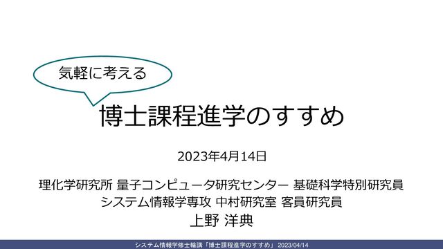東大情報理工システム情報学専攻の修士輪講にて「博士課程進学のすすめ」として話したスライドです。 聴衆としては主に計数システム→システム情報学専攻の方を想定していますが、情報系の院生であれば参考になる点はあると思います。