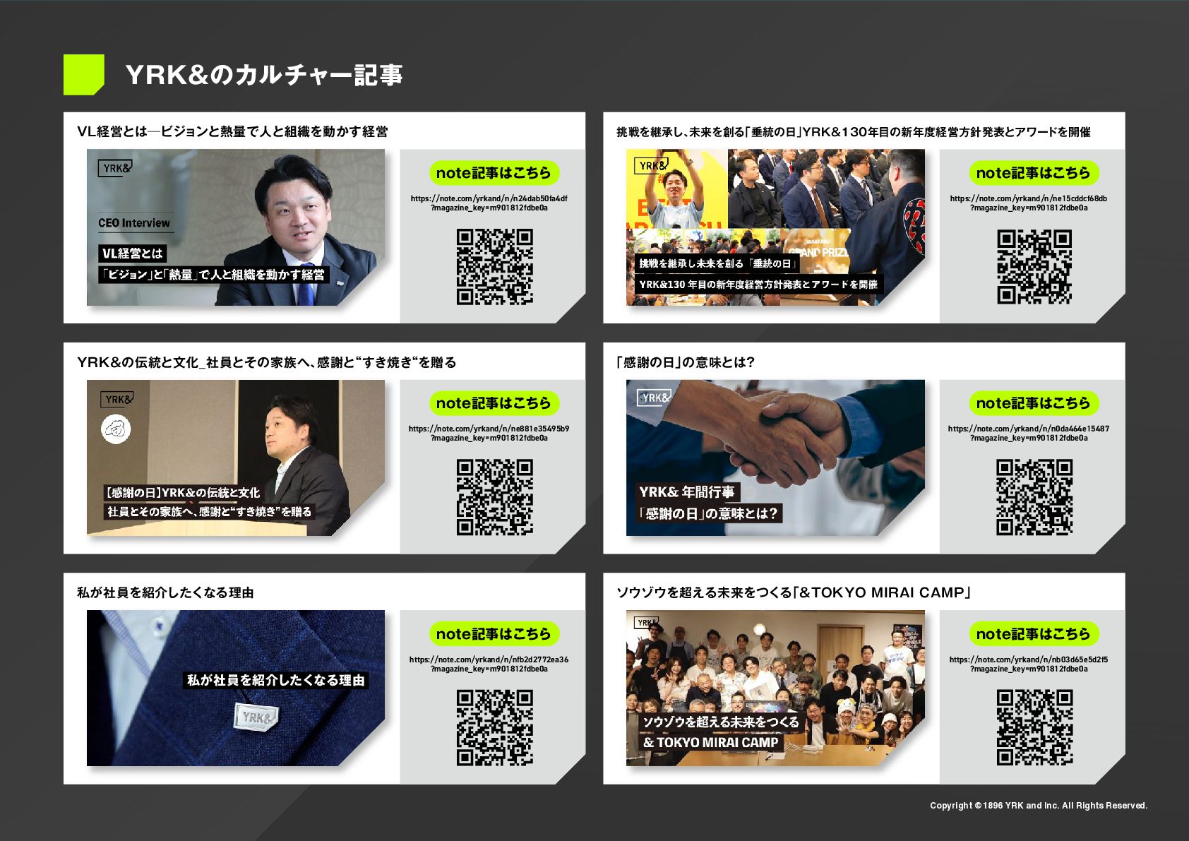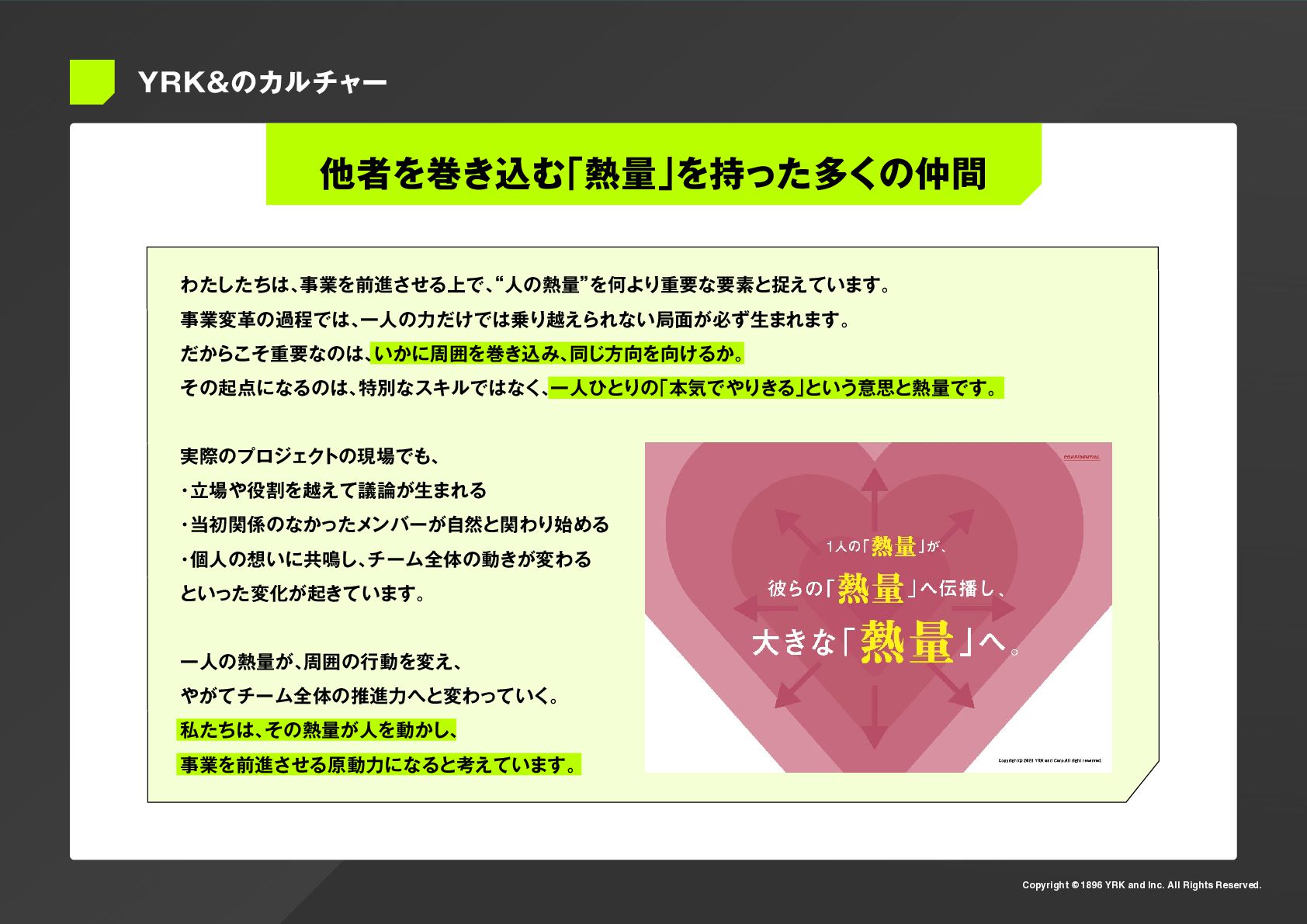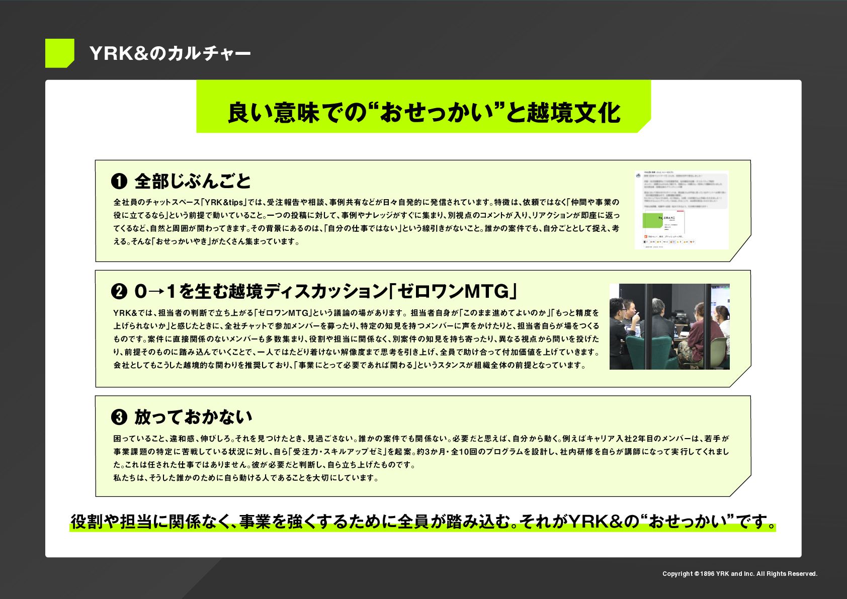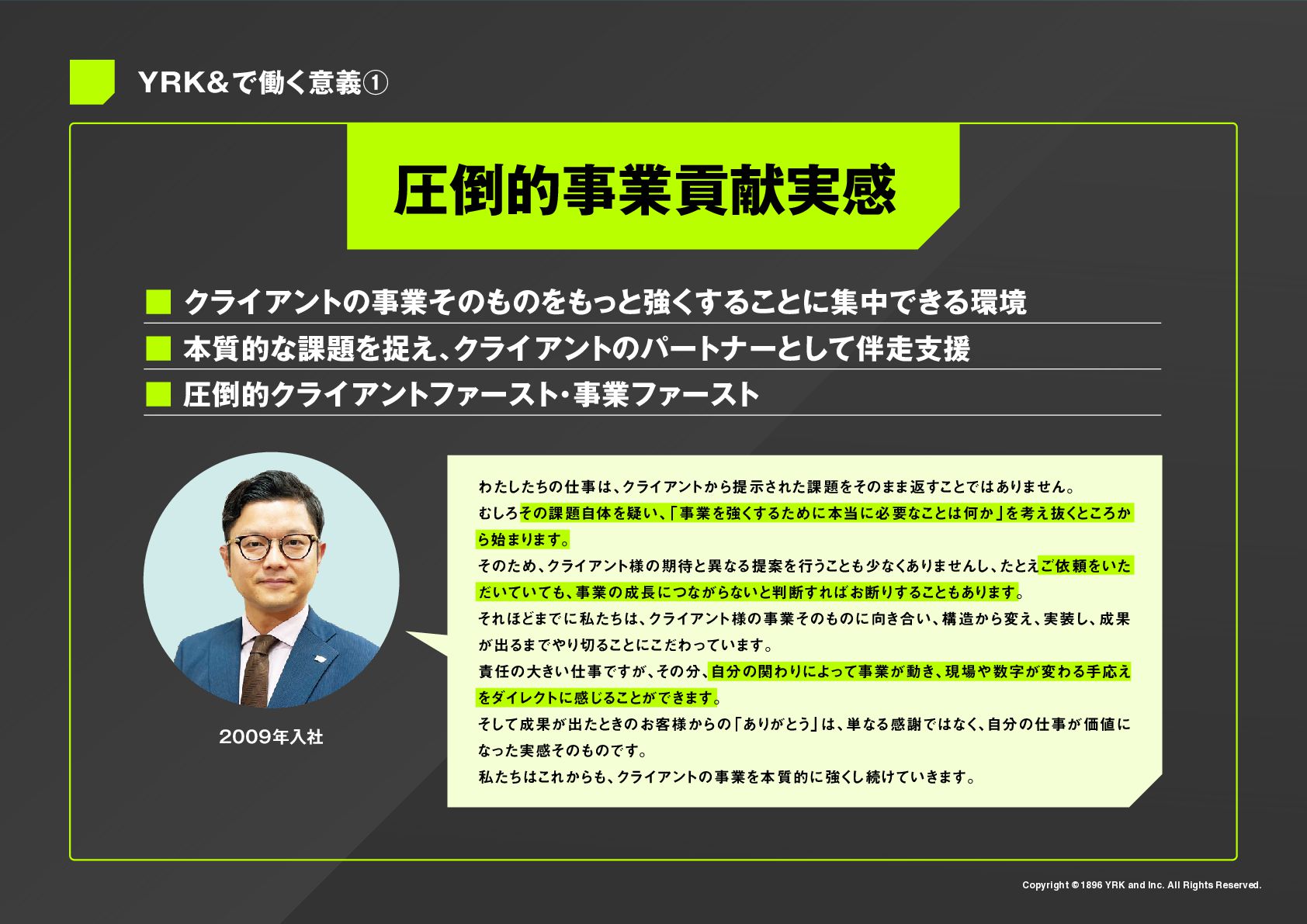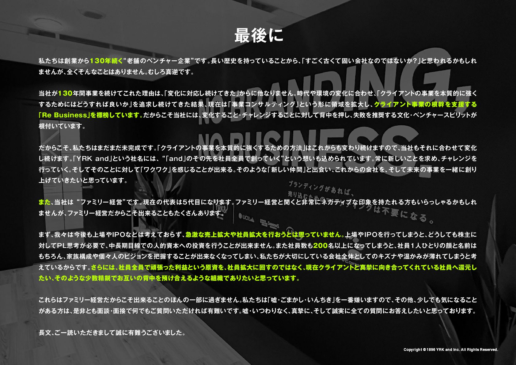 © 1896 YRK and Inc. All Rights Reserved. ࠷ޙʹ ࢲͨͪ͸૑ۀ͔Β೥ଓ͘ ʠ࿝ฮͷϕϯνϟʔاۀʡ Ͱ͢ɻ ௕͍ྺ࢙Λ͍࣋ͬͯΔ͜ͱ͔Βɺ ʮ͘͢͝ݹͯ͘ݻ͍ձࣾͳͷͰ͸ͳ͍͔ʁʯ ͱࢥΘΕΔ͔΋͠Ε ·ͤΜ͕ɺ શͦ͘Μͳ͜ͱ͸͋Γ·ͤΜɻ Ή͠ΖਅٯͰ͢ɻ ౰͕ࣾ೥ؒࣄۀΛଓ͚ͯ͜Εͨཧ༝͸ɺ ʮมԽʹରԠ͠ଓ͚͖ͯͨʯ ͔ΒʹଞͳΓ·ͤΜɻ ࣌୅΍؀ڥͷมԽʹ߹Θͤɺ ʮΫϥΠΞϯτͷࣄۀΛຊ࣭తʹڧ͘ ͢ΔͨΊʹ͸Ͳ͏͢Ε͹ྑ͍͔ʯ Λ௥ٻ͠ଓ͚͖ͯͨ݁Ռɺ ݱࡏ͸ ʮࣄۀίϯαϧςΟϯάʯ ͱ͍͏ܗʹྖҬΛ֦େ͠ɺ ΫϥΠΞϯτࣄۀͷࠜװΛࢧԉ͢Δ ʮ3F#VTJOFTTʯ Λඪᒗ͍ͯ͠·͢ɻ ͔ͩΒͦ͜౰ࣾʹ͸ɺ มԽ͢Δ͜ͱ ɾ νϟϨϯδ͢Δ͜ͱʹରͯ͠എதΛԡ͠ɺ ࣦഊΛਪ঑͢ΔจԽ ɾ ϕϯνϟʔεϐϦο τ͕ ࠜ෇͍͍ͯ·͢ɻ ͔ͩΒͦ͜ɺ ࢲͨͪ͸·ͩ·ͩະ׬੒Ͱ͢ɻ ʮΫϥΠΞϯτͷࣄۀΛຊ࣭తʹڧ͘͢ΔͨΊͷํ๏ʯ ͸͜Ε͔Β΋มΘΓଓ͚·͢ͷͰɺ ౰ࣾ΋ͦΕʹ߹ΘͤͯมԽ ͠ଓ͚·͢ɻ ʮ:3,BOEʯ ͱ͍͏໊ࣾʹ͸ɺ  ʠ ʮBOEʯ ͷͦͷઌΛࣾһશһͰ૑͍ͬͯ͘ʡ ͱ͍͏૝͍΋ࠐΊΒΕ͍ͯ·͢ɻ ৗʹ৽͍͜͠ͱΛٻΊɺ νϟϨϯδΛ ߦ͍ͬͯ͘ɻ ͦͯͦ͠ͷ͜ͱʹରͯ͠ ʮϫΫϫΫʯ Λײ͡Δ͜ͱ͕ग़དྷΔɻ ͦͷΑ͏ͳ ʮ৽͍͠஥ؒʯ ͱग़ձ͍ɺ ͜Ε͔ΒͷձࣾΛɺ ͦͯ͠ະདྷͷࣄۀΛҰॹʹ૑Γ ্͍͖͍͛ͯͨͱࢥ͍ͬͯ·͢ɻ ·ͨɺ ౰ࣾ͸ ʠϑΝϛϦʔܦӦʡ Ͱ͢ɻ ݱࡏͷ୅ද͸୅໨ʹͳΓ·͢ɻ ϑΝϛϦʔܦӦͱฉ͘ͱඇৗʹωΨςΟϒͳҹ৅Λ࣋ͨΕΔํ΋͍Βͬ͠ΌΔ͔΋͠Ε ·ͤΜ͕ɺ ϑΝϛϦʔܦӦ͔ͩΒͦ͜ग़དྷΔ͜ͱ΋ͨ͘͞Μ͋Γ·͢ɻ ·ͣɺ զʑ͸ࠓޙ΋্৔΍*10ͳͲ͸ߟ͓͑ͯΒͣɺ ٸܹͳച্֦େ΍ࣾһ֦େΛߦ͓͏ͱ͸ࢥ͍ͬͯ·ͤΜɻ ্৔΍*10Λߦͬͯ͠·͏ͱɺ Ͳ͏ͯ͠΋גओʹ ରͯ͠1-ࢥߟ͕ඞཁͰɺ த௕ظ໨ઢͰͷਓతࢿຊ΁ͷ౤ࢿΛߦ͏͜ͱ͕ग़དྷ·ͤΜɻ ·ͨࣾһ਺΋໊Ҏ্ʹͳͬͯ͠·͏ͱɺ ࣾһਓͻͱΓͷإͱ໊લ͸ ΋ͪΖΜɺ Ո଒ߏ੒΍ݸʑਓͷϏδϣϯΛ೺Ѳ͢Δ͜ͱ͕ग़དྷͳ͘ͳͬͯ͠·͍ɺ ࢲ͕ͨͪେ੾ʹ͍ͯ͠Δձࣾશମͱͯ͠ͷΩζφ΍Թ͔Έ͕ബΕͯ͠·͏ͱߟ ͍͑ͯΔ͔ΒͰ͢ɻ ͞Βʹ͸ɺ ࣾһશһͰؤுͬͨརӹͱ͍͏ݪࢿΛɺ ࣾһ֦େʹճ͢ͷͰ͸ͳ͘ɺ ݱࡏΫϥΠΞϯτͱਅ᎜ʹ޲͖߹ͬͯ͘Ε͍ͯΔࣾһ΁ؐݩ͠ ͍ͨɺ ͦͷΑ͏ͳগ਺ਫ਼ӶͰ͓ޓ͍ͷഎதΛ༬͚߹͑ΔΑ͏ͳ૊৫Ͱ͋Γ͍ͨͱࢥ͍ͬͯ·͢ɻ ͜ΕΒ͸ϑΝϛϦʔܦӦ͔ͩΒͦ͜ग़དྷΔ͜ͱͷ΄ΜͷҰ෦ʹա͗·ͤΜɻ ࢲͨͪ͸ ʮӕ ɾ ͝·͔͠ ɾ ͍Μ͖ͪʯ ΛҰ൪ݏ͍·͢ͷͰɺ ͦͷଞɺ গ͠Ͱ΋ؾʹͳΔ͜ͱ ͕͋Δํ͸ɺ ੋඇͱ΋໘ஊ ɾ ໘઀ͰԿͰ΋࣭͝໰͍͚ͨͩΕ͹༗೉͍Ͱ͢ɻ ӕ ɾ ͍ͭΘΓͳ͘ɺ ਅ᎜ʹɺ ͦͯ͠੣࣮ʹશͯͷ࣭໰ʹ͓౴͍͑ͨ͠ͱࢥ͓ͬͯΓ·͢ɻ ௕จɺ ͝Ұಡ͍͖ͨͩ·ͯ͠੣ʹ༗೉͏͍͟͝·ͨ͠ɻ