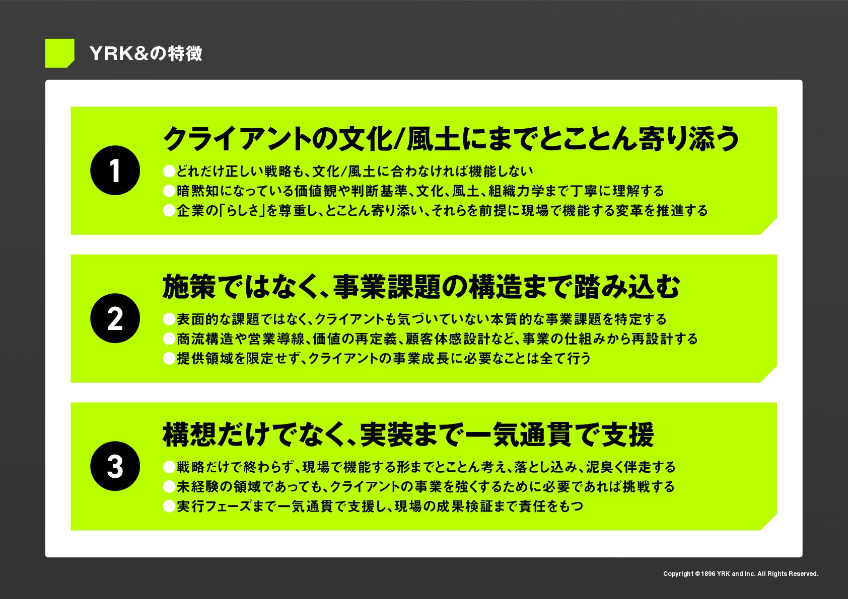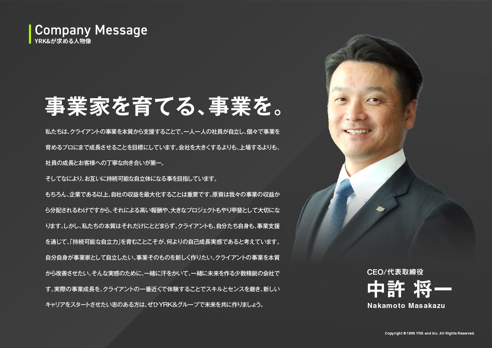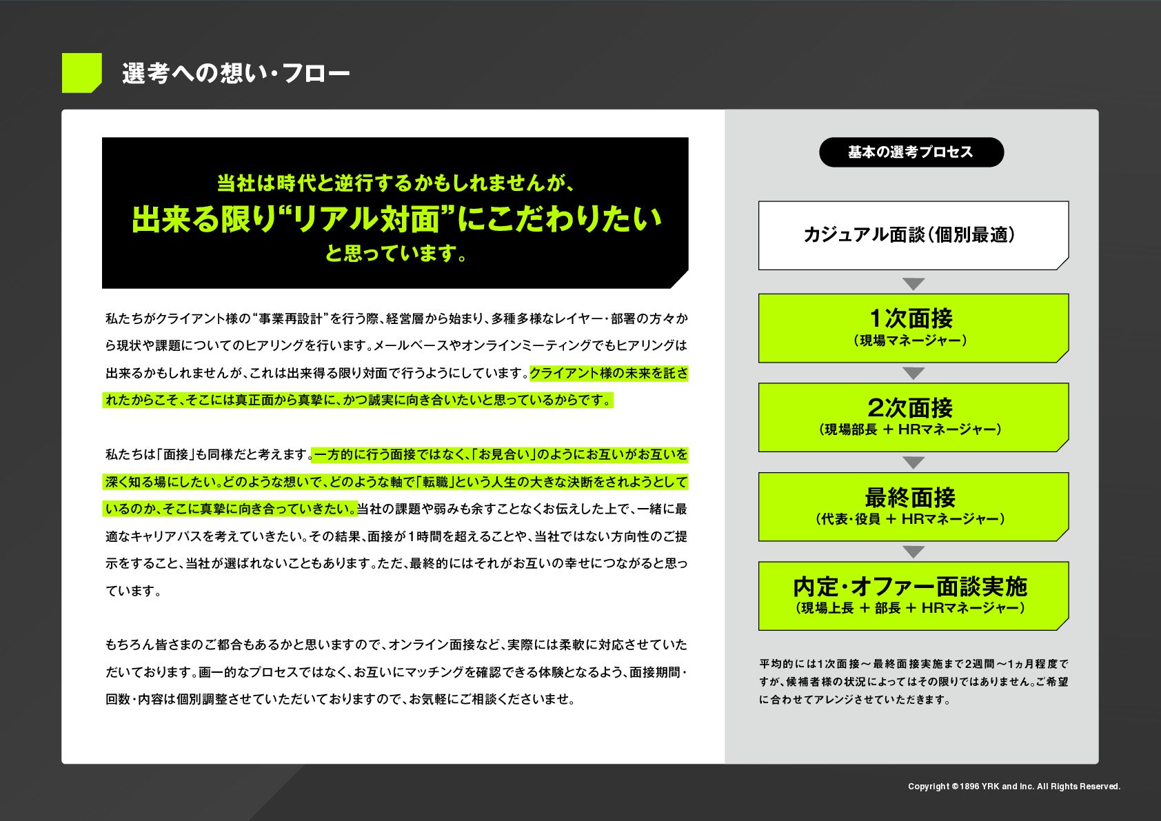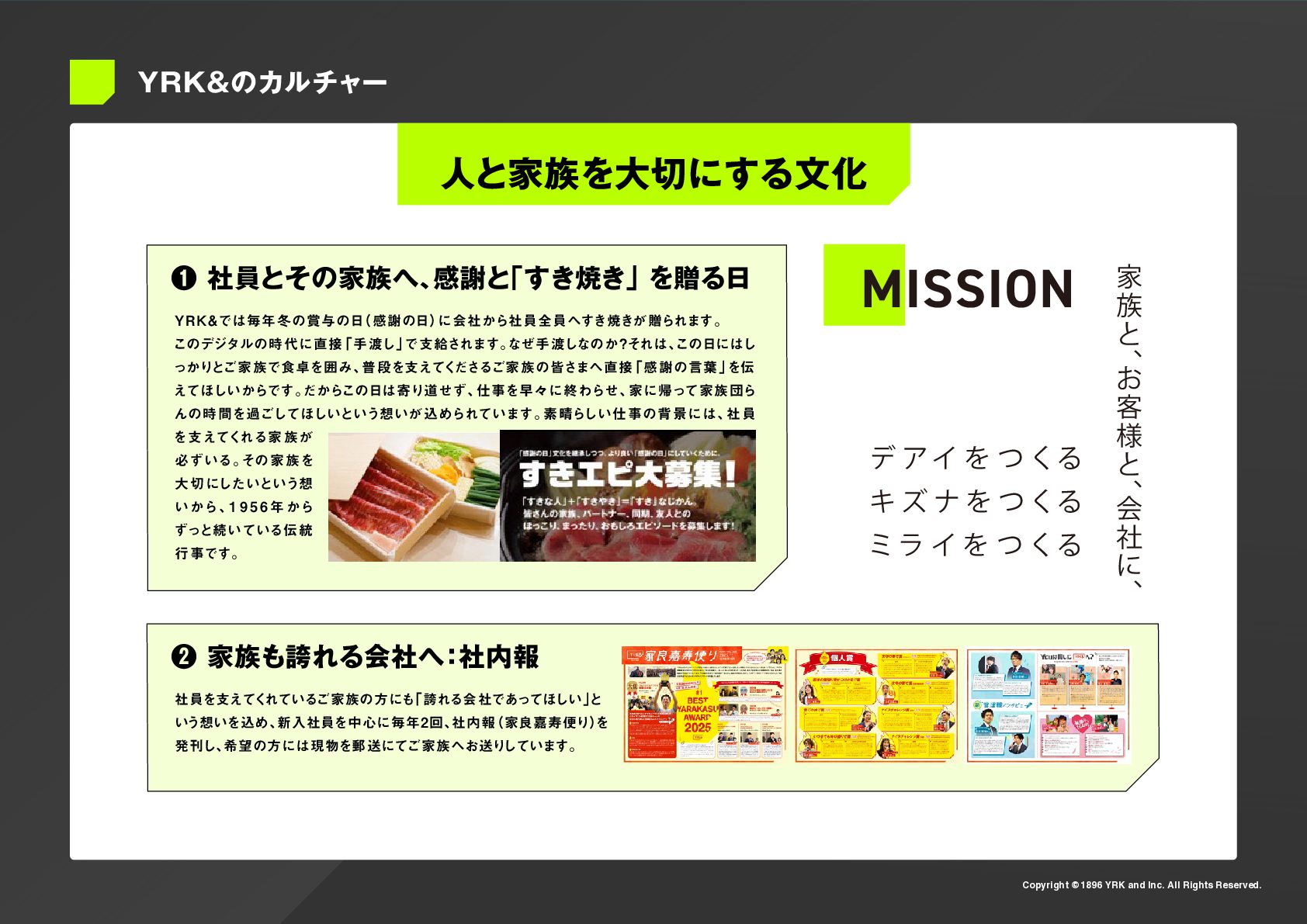 © 1896 YRK and Inc. All Rights Reserved. ࠷ޙʹ ࢲͨͪ͸૑ۀ͔Β೥ଓ͘ ʠ࿝ฮͷϕϯνϟʔاۀʡ Ͱ͢ɻ ௕͍ྺ࢙Λ͍࣋ͬͯΔ͜ͱ͔Βɺ ʮ͘͢͝ݹͯ͘ݻ͍ձࣾͳͷͰ͸ͳ͍͔ʁʯ ͱࢥΘΕΔ͔΋͠Ε ·ͤΜ͕ɺ શͦ͘Μͳ͜ͱ͸͋Γ·ͤΜɻ Ή͠ΖਅٯͰ͢ɻ ౰͕ࣾ೥ؒࣄۀΛଓ͚ͯ͜Εͨཧ༝͸ɺ ʮมԽʹରԠ͠ଓ͚͖ͯͨʯ ͔ΒʹଞͳΓ·ͤΜɻ ࣌୅΍؀ڥͷมԽʹ߹Θͤɺ ʮΫϥΠΞϯτͷࣄۀΛຊ࣭తʹڧ͘ ͢ΔͨΊʹ͸Ͳ͏͢Ε͹ྑ͍͔ʯ Λ௥ٻ͠ଓ͚͖ͯͨ݁Ռɺ ݱࡏ͸ ʮࣄۀίϯαϧςΟϯάʯ ͱ͍͏ܗʹྖҬΛ֦େ͠ɺ ΫϥΠΞϯτࣄۀͷࠜװΛࢧԉ͢Δ ʮ3F#VTJOFTTʯ Λඪᒗ͍ͯ͠·͢ɻ ͔ͩΒͦ͜౰ࣾʹ͸ɺ มԽ͢Δ͜ͱ ɾ νϟϨϯδ͢Δ͜ͱʹରͯ͠എதΛԡ͠ɺ ࣦഊΛਪ঑͢ΔจԽ ɾ ϕϯνϟʔεϐϦο τ͕ ࠜ෇͍͍ͯ·͢ɻ ͔ͩΒͦ͜ɺ ࢲͨͪ͸·ͩ·ͩະ׬੒Ͱ͢ɻ ʮΫϥΠΞϯτͷࣄۀΛຊ࣭తʹڧ͘͢ΔͨΊͷํ๏ʯ ͸͜Ε͔Β΋มΘΓଓ͚·͢ͷͰɺ ౰ࣾ΋ͦΕʹ߹ΘͤͯมԽ ͠ଓ͚·͢ɻ ʮ:3,BOEʯ ͱ͍͏໊ࣾʹ͸ɺ  ʠ ʮBOEʯ ͷͦͷઌΛࣾһશһͰ૑͍ͬͯ͘ʡ ͱ͍͏૝͍΋ࠐΊΒΕ͍ͯ·͢ɻ ৗʹ৽͍͜͠ͱΛٻΊɺ νϟϨϯδΛ ߦ͍ͬͯ͘ɻ ͦͯͦ͠ͷ͜ͱʹରͯ͠ ʮϫΫϫΫʯ Λײ͡Δ͜ͱ͕ग़དྷΔɻ ͦͷΑ͏ͳ ʮ৽͍͠஥ؒʯ ͱग़ձ͍ɺ ͜Ε͔ΒͷձࣾΛɺ ͦͯ͠ະདྷͷࣄۀΛҰॹʹ૑Γ ্͍͖͍͛ͯͨͱࢥ͍ͬͯ·͢ɻ ·ͨɺ ౰ࣾ͸ ʠϑΝϛϦʔܦӦʡ Ͱ͢ɻ ݱࡏͷ୅ද͸୅໨ʹͳΓ·͢ɻ ϑΝϛϦʔܦӦͱฉ͘ͱඇৗʹωΨςΟϒͳҹ৅Λ࣋ͨΕΔํ΋͍Βͬ͠ΌΔ͔΋͠Ε ·ͤΜ͕ɺ ϑΝϛϦʔܦӦ͔ͩΒͦ͜ग़དྷΔ͜ͱ΋ͨ͘͞Μ͋Γ·͢ɻ ·ͣɺ զʑ͸ࠓޙ΋্৔΍*10ͳͲ͸ߟ͓͑ͯΒͣɺ ٸܹͳച্֦େ΍ࣾһ֦େΛߦ͓͏ͱ͸ࢥ͍ͬͯ·ͤΜɻ ্৔΍*10Λߦͬͯ͠·͏ͱɺ Ͳ͏ͯ͠΋גओʹ ରͯ͠1-ࢥߟ͕ඞཁͰɺ த௕ظ໨ઢͰͷਓతࢿຊ΁ͷ౤ࢿΛߦ͏͜ͱ͕ग़དྷ·ͤΜɻ ·ͨࣾһ਺΋໊Ҏ্ʹͳͬͯ͠·͏ͱɺ ࣾһਓͻͱΓͷإͱ໊લ͸ ΋ͪΖΜɺ Ո଒ߏ੒΍ݸʑਓͷϏδϣϯΛ೺Ѳ͢Δ͜ͱ͕ग़དྷͳ͘ͳͬͯ͠·͍ɺ ࢲ͕ͨͪେ੾ʹ͍ͯ͠Δձࣾશମͱͯ͠ͷΩζφ΍Թ͔Έ͕ബΕͯ͠·͏ͱߟ ͍͑ͯΔ͔ΒͰ͢ɻ ͞Βʹ͸ɺ ࣾһશһͰؤுͬͨརӹͱ͍͏ݪࢿΛɺ ࣾһ֦େʹճ͢ͷͰ͸ͳ͘ɺ ݱࡏΫϥΠΞϯτͱਅ᎜ʹ޲͖߹ͬͯ͘Ε͍ͯΔࣾһ΁ؐݩ͠ ͍ͨɺ ͦͷΑ͏ͳগ਺ਫ਼ӶͰ͓ޓ͍ͷഎதΛ༬͚߹͑ΔΑ͏ͳ૊৫Ͱ͋Γ͍ͨͱࢥ͍ͬͯ·͢ɻ ͜ΕΒ͸ϑΝϛϦʔܦӦ͔ͩΒͦ͜ग़དྷΔ͜ͱͷ΄ΜͷҰ෦ʹա͗·ͤΜɻ ࢲͨͪ͸ ʮӕ ɾ ͝·͔͠ ɾ ͍Μ͖ͪʯ ΛҰ൪ݏ͍·͢ͷͰɺ ͦͷଞɺ গ͠Ͱ΋ؾʹͳΔ͜ͱ ͕͋Δํ͸ɺ ੋඇͱ΋໘ஊ ɾ ໘઀ͰԿͰ΋࣭͝໰͍͚ͨͩΕ͹༗೉͍Ͱ͢ɻ ӕ ɾ ͍ͭΘΓͳ͘ɺ ਅ᎜ʹɺ ͦͯ͠੣࣮ʹશͯͷ࣭໰ʹ͓౴͍͑ͨ͠ͱࢥ͓ͬͯΓ·͢ɻ ௕จɺ ͝Ұಡ͍͖ͨͩ·ͯ͠੣ʹ༗೉͏͍͟͝·ͨ͠ɻ