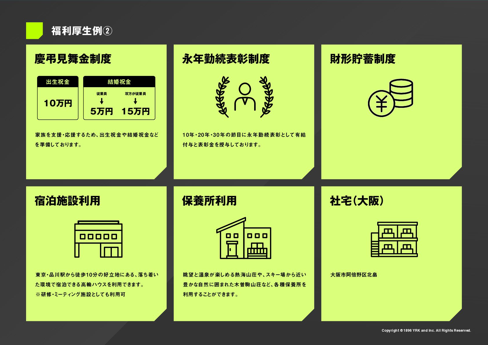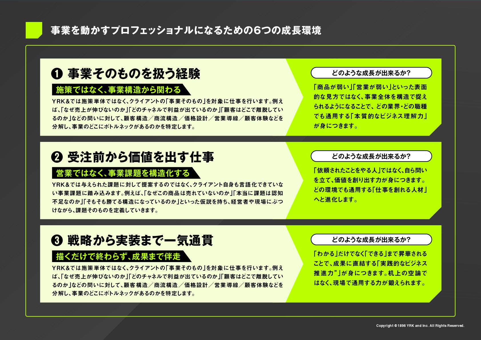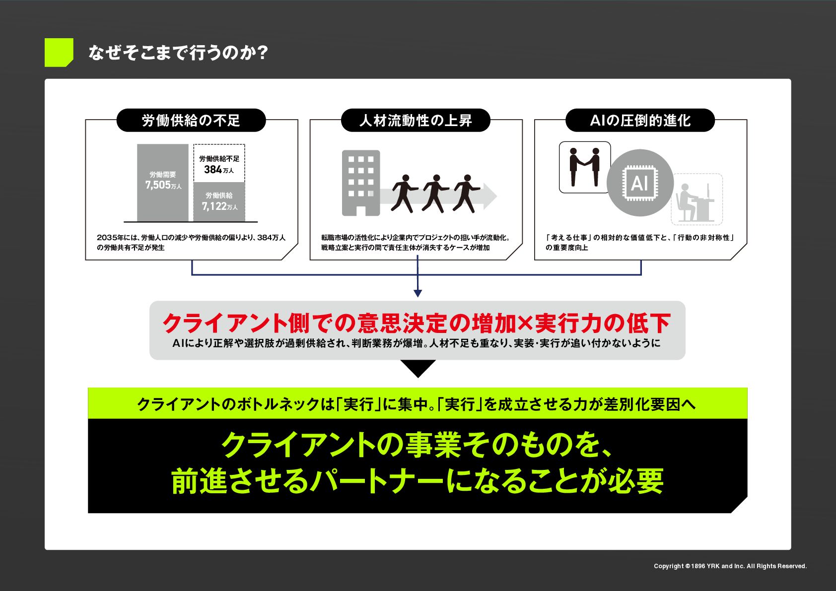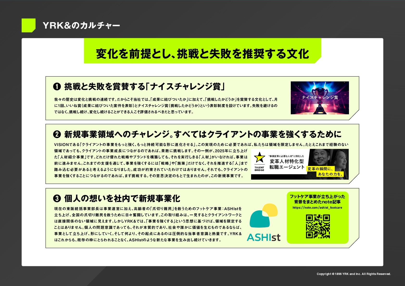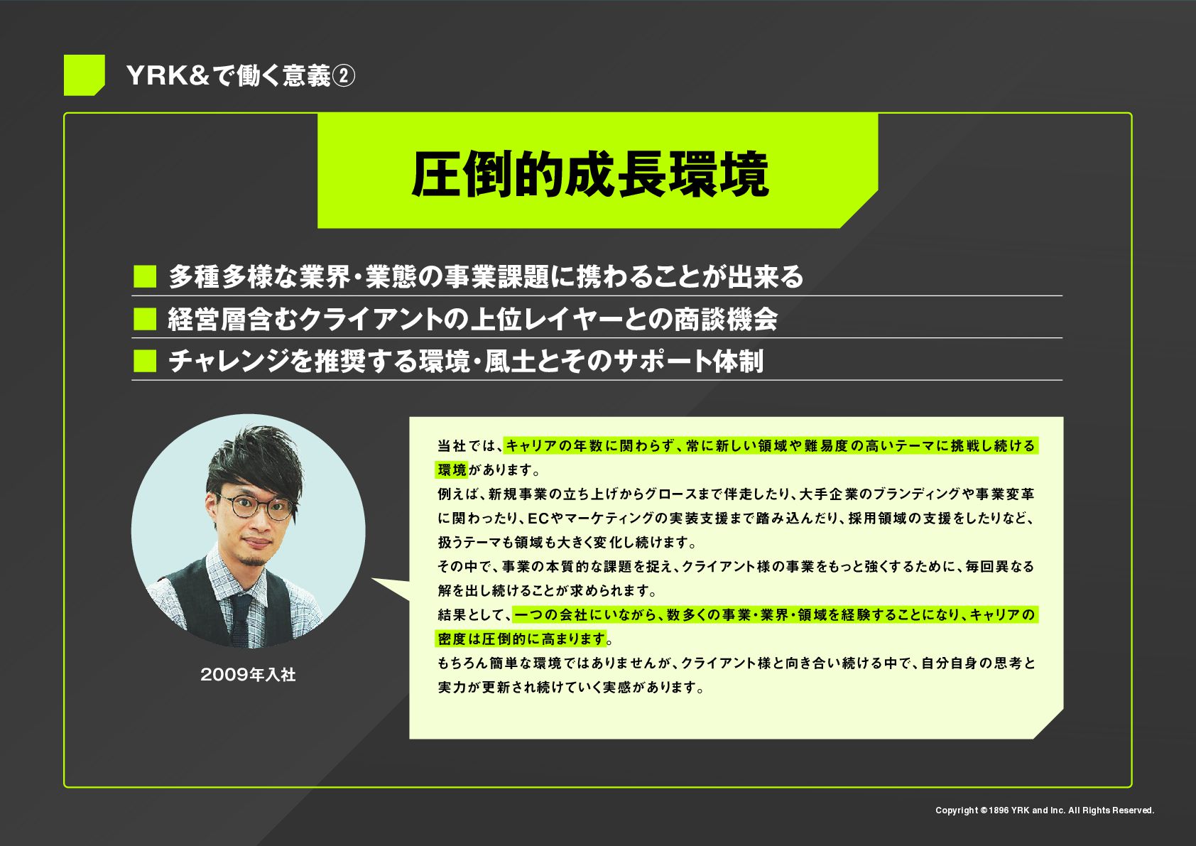 © 1896 YRK and Inc. All Rights Reserved. ࠷ޙʹ ࢲͨͪ͸૑ۀ͔Β೥ଓ͘ ʠ࿝ฮͷϕϯνϟʔاۀʡ Ͱ͢ɻ ௕͍ྺ࢙Λ͍࣋ͬͯΔ͜ͱ͔Βɺ ʮ͘͢͝ݹͯ͘ݻ͍ձࣾͳͷͰ͸ͳ͍͔ʁʯ ͱࢥΘΕΔ͔΋͠Ε ·ͤΜ͕ɺ શͦ͘Μͳ͜ͱ͸͋Γ·ͤΜɻ Ή͠ΖਅٯͰ͢ɻ ౰͕ࣾ೥ؒࣄۀΛଓ͚ͯ͜Εͨཧ༝͸ɺ ʮมԽʹରԠ͠ଓ͚͖ͯͨʯ ͔ΒʹଞͳΓ·ͤΜɻ ࣌୅΍؀ڥͷมԽʹ߹Θͤɺ ʮΫϥΠΞϯτͷࣄۀΛຊ࣭తʹڧ͘ ͢ΔͨΊʹ͸Ͳ͏͢Ε͹ྑ͍͔ʯ Λ௥ٻ͠ଓ͚͖ͯͨ݁Ռɺ ݱࡏ͸ ʮࣄۀίϯαϧςΟϯάʯ ͱ͍͏ܗʹྖҬΛ֦େ͠ɺ ΫϥΠΞϯτࣄۀͷࠜװΛࢧԉ͢Δ ʮ3F#VTJOFTTʯ Λඪᒗ͍ͯ͠·͢ɻ ͔ͩΒͦ͜౰ࣾʹ͸ɺ มԽ͢Δ͜ͱ ɾ νϟϨϯδ͢Δ͜ͱʹରͯ͠എதΛԡ͠ɺ ࣦഊΛਪ঑͢ΔจԽ ɾ ϕϯνϟʔεϐϦο τ͕ ࠜ෇͍͍ͯ·͢ɻ ͔ͩΒͦ͜ɺ ࢲͨͪ͸·ͩ·ͩະ׬੒Ͱ͢ɻ ʮΫϥΠΞϯτͷࣄۀΛຊ࣭తʹڧ͘͢ΔͨΊͷํ๏ʯ ͸͜Ε͔Β΋มΘΓଓ͚·͢ͷͰɺ ౰ࣾ΋ͦΕʹ߹ΘͤͯมԽ ͠ଓ͚·͢ɻ ʮ:3,BOEʯ ͱ͍͏໊ࣾʹ͸ɺ  ʠ ʮBOEʯ ͷͦͷઌΛࣾһશһͰ૑͍ͬͯ͘ʡ ͱ͍͏૝͍΋ࠐΊΒΕ͍ͯ·͢ɻ ৗʹ৽͍͜͠ͱΛٻΊɺ νϟϨϯδΛ ߦ͍ͬͯ͘ɻ ͦͯͦ͠ͷ͜ͱʹରͯ͠ ʮϫΫϫΫʯ Λײ͡Δ͜ͱ͕ग़དྷΔɻ ͦͷΑ͏ͳ ʮ৽͍͠஥ؒʯ ͱग़ձ͍ɺ ͜Ε͔ΒͷձࣾΛɺ ͦͯ͠ະདྷͷࣄۀΛҰॹʹ૑Γ ্͍͖͍͛ͯͨͱࢥ͍ͬͯ·͢ɻ ·ͨɺ ౰ࣾ͸ ʠϑΝϛϦʔܦӦʡ Ͱ͢ɻ ݱࡏͷ୅ද͸୅໨ʹͳΓ·͢ɻ ϑΝϛϦʔܦӦͱฉ͘ͱඇৗʹωΨςΟϒͳҹ৅Λ࣋ͨΕΔํ΋͍Βͬ͠ΌΔ͔΋͠Ε ·ͤΜ͕ɺ ϑΝϛϦʔܦӦ͔ͩΒͦ͜ग़དྷΔ͜ͱ΋ͨ͘͞Μ͋Γ·͢ɻ ·ͣɺ զʑ͸ࠓޙ΋্৔΍*10ͳͲ͸ߟ͓͑ͯΒͣɺ ٸܹͳച্֦େ΍ࣾһ֦େΛߦ͓͏ͱ͸ࢥ͍ͬͯ·ͤΜɻ ্৔΍*10Λߦͬͯ͠·͏ͱɺ Ͳ͏ͯ͠΋גओʹ ରͯ͠1-ࢥߟ͕ඞཁͰɺ த௕ظ໨ઢͰͷਓతࢿຊ΁ͷ౤ࢿΛߦ͏͜ͱ͕ग़དྷ·ͤΜɻ ·ͨࣾһ਺΋໊Ҏ্ʹͳͬͯ͠·͏ͱɺ ࣾһਓͻͱΓͷإͱ໊લ͸ ΋ͪΖΜɺ Ո଒ߏ੒΍ݸʑਓͷϏδϣϯΛ೺Ѳ͢Δ͜ͱ͕ग़དྷͳ͘ͳͬͯ͠·͍ɺ ࢲ͕ͨͪେ੾ʹ͍ͯ͠Δձࣾશମͱͯ͠ͷΩζφ΍Թ͔Έ͕ബΕͯ͠·͏ͱߟ ͍͑ͯΔ͔ΒͰ͢ɻ ͞Βʹ͸ɺ ࣾһશһͰؤுͬͨརӹͱ͍͏ݪࢿΛɺ ࣾһ֦େʹճ͢ͷͰ͸ͳ͘ɺ ݱࡏΫϥΠΞϯτͱਅ᎜ʹ޲͖߹ͬͯ͘Ε͍ͯΔࣾһ΁ؐݩ͠ ͍ͨɺ ͦͷΑ͏ͳগ਺ਫ਼ӶͰ͓ޓ͍ͷഎதΛ༬͚߹͑ΔΑ͏ͳ૊৫Ͱ͋Γ͍ͨͱࢥ͍ͬͯ·͢ɻ ͜ΕΒ͸ϑΝϛϦʔܦӦ͔ͩΒͦ͜ग़དྷΔ͜ͱͷ΄ΜͷҰ෦ʹա͗·ͤΜɻ ࢲͨͪ͸ ʮӕ ɾ ͝·͔͠ ɾ ͍Μ͖ͪʯ ΛҰ൪ݏ͍·͢ͷͰɺ ͦͷଞɺ গ͠Ͱ΋ؾʹͳΔ͜ͱ ͕͋Δํ͸ɺ ੋඇͱ΋໘ஊ ɾ ໘઀ͰԿͰ΋࣭͝໰͍͚ͨͩΕ͹༗೉͍Ͱ͢ɻ ӕ ɾ ͍ͭΘΓͳ͘ɺ ਅ᎜ʹɺ ͦͯ͠੣࣮ʹશͯͷ࣭໰ʹ͓౴͍͑ͨ͠ͱࢥ͓ͬͯΓ·͢ɻ ௕จɺ ͝Ұಡ͍͖ͨͩ·ͯ͠੣ʹ༗೉͏͍͟͝·ͨ͠ɻ