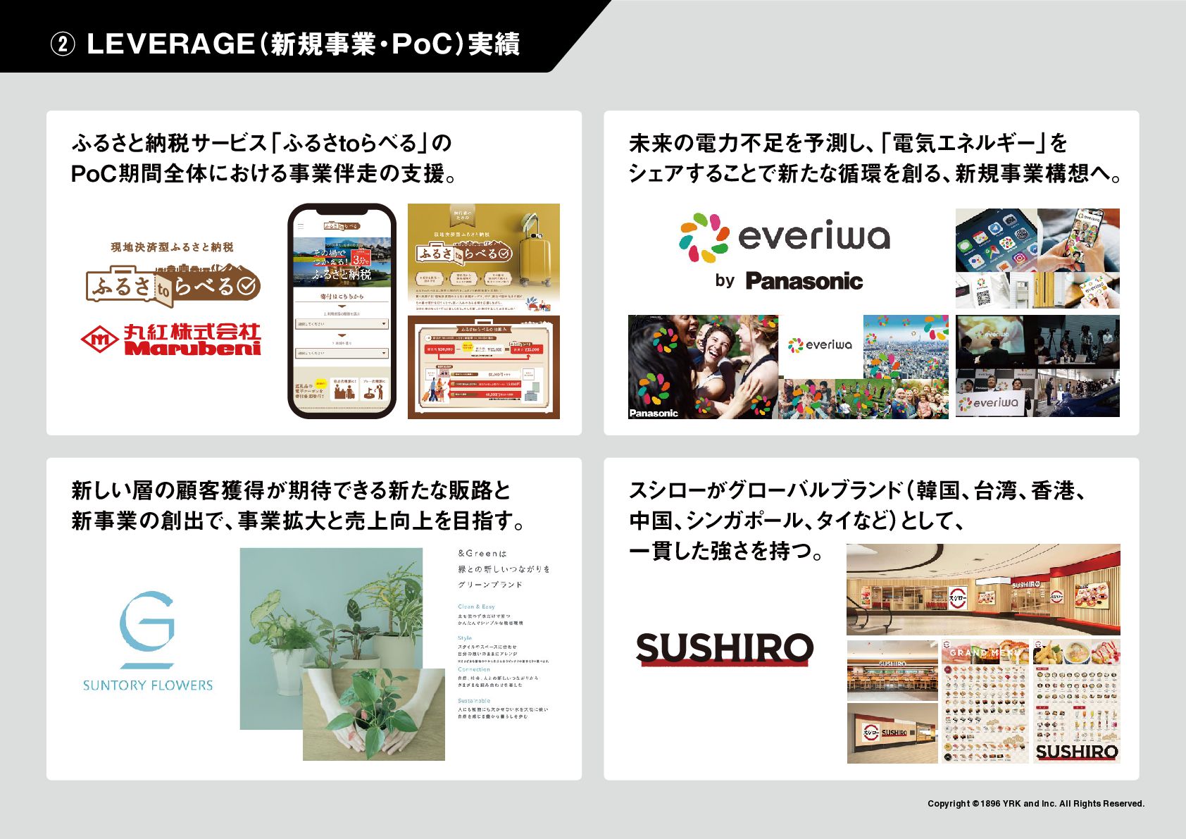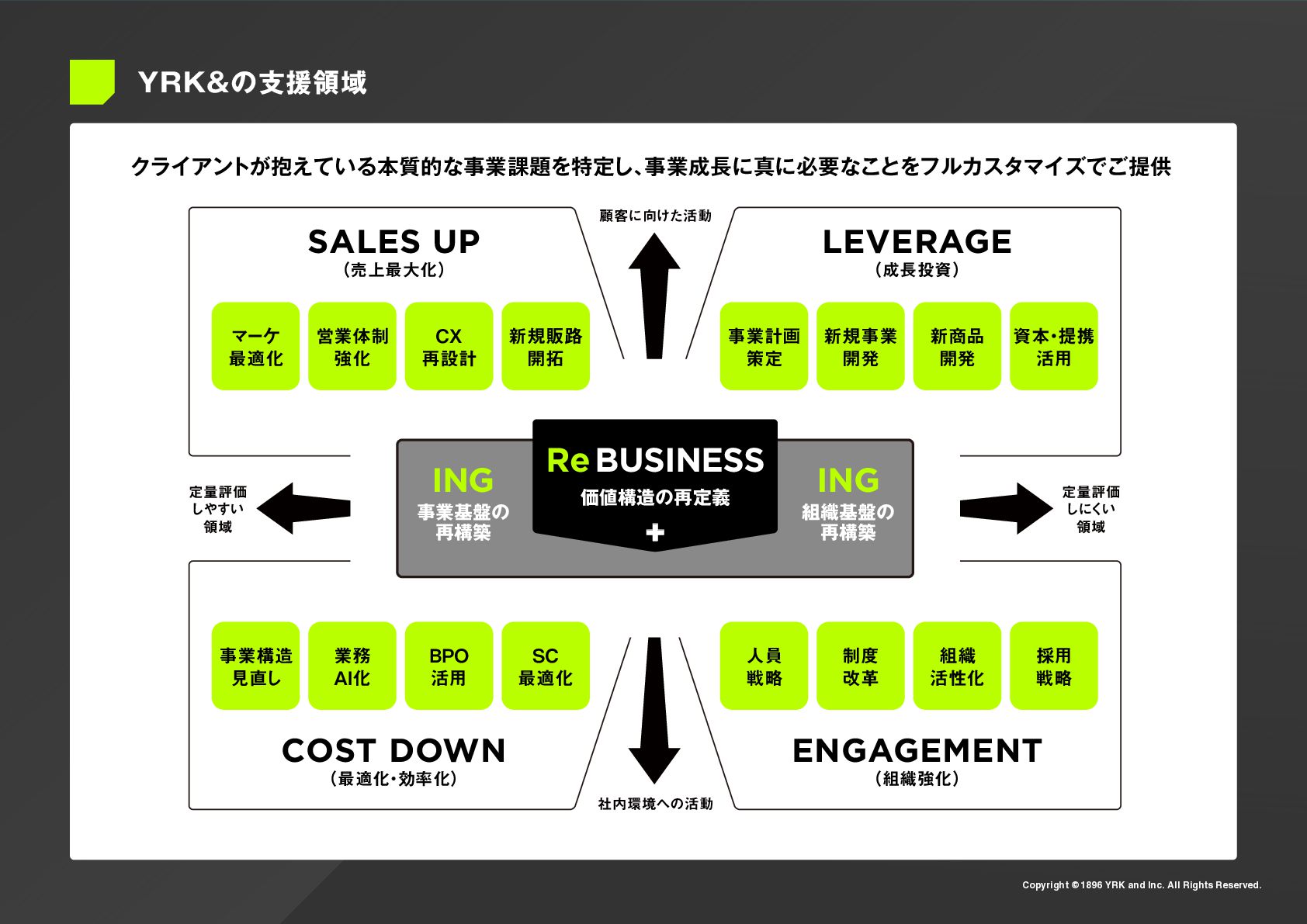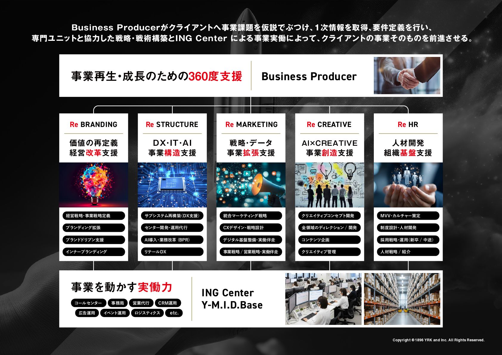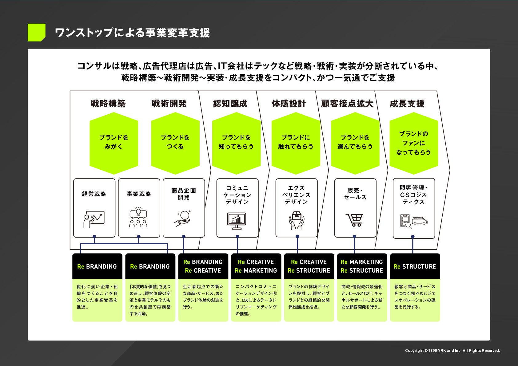 ܦӦվֵࢧԉ ܦӦઓུ ɾ ࣄۀઓུఆٛ ϒϥϯσΟ ϯά֦ு ϒϥϯυ υϦϒϯࢧԉ ΠϯφʔϒϥϯσΟ ϯά Re BRANDING αϒγεςϜ࠶ߏங ʢ%9ࢧԉʣ ηϯλʔ։ൃ ɾ ӡ༻୅ߦ "*ಋೖ ɾ ۀ຿վֵ #13 Ϧςʔϧ%9 %9 ɾ *5 ɾ "* ࣄۀߏ଄ࢧԉ Re STRUCTURE ίʔϧηϯλʔ ࣄ຿ہ Ӧۀ୅ߦ $3.ӡ༻ ޿ࠂӡ༻ Πϕϯτӡ༻ ϩδεςΟ Ϋε FUD Copyright © 1896 YRK and Inc. All Rights Reserved. #VTJOFTT1SPEVDFS͕ΫϥΠΞϯτ΁ࣄۀ՝୊ΛԾઆͰͿ͚ͭɺ ࣍৘ใΛऔಘɺ ཁ݅ఆٛΛߦ͍ɺ ઐ໳Ϣχοτͱڠྗͨ͠ઓུɾઓज़ߏஙͱ*/($FOUFSʹΑΔࣄۀ࣮ಇʹΑͬͯɺ ΫϥΠΞϯτͷࣄۀͦͷ΋ͷΛલਐͤ͞Δɻ ઓུ ɾ σʔλ ࣄۀ֦ுࢧԉ ౷߹ϚʔέςΟ ϯάઓུ $9σβΠϯ ɾ ઓུઃܭ σδλϧج൫੔උ ɾ ࣮ಇ൐૸ ࣄۀઓུӦۀઓུ ɾ ࣮ಇ൐૸ Re MARKETING "*ʷ$3&"5*7& ࣄۀ૑଄ࢧԉ ΫϦΤΠςΟ ϒίϯηϓτ։ൃ શྖҬͷσΟ ϨΫγϣϯ։ൃ ίϯςϯπاը ΫϦΤΠςΟ ϒ؅ཧ Re CREATIVE ਓࡐ։ൃ ૊৫ج൫ࢧԉ .77 ɾ Χϧνϟʔࡦఆ ੍౓ઃܭ ɾ ਓࡐ։ൃ ࠾༻ઓུ ɾ ӡ༻ ʢ৽ଔத్ʣ ਓࡐઓུ঺հ Re HR