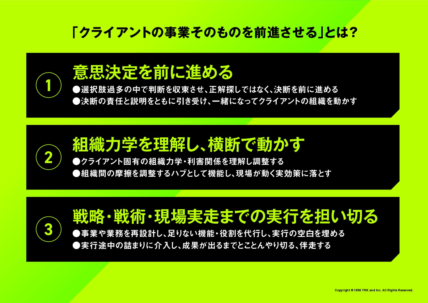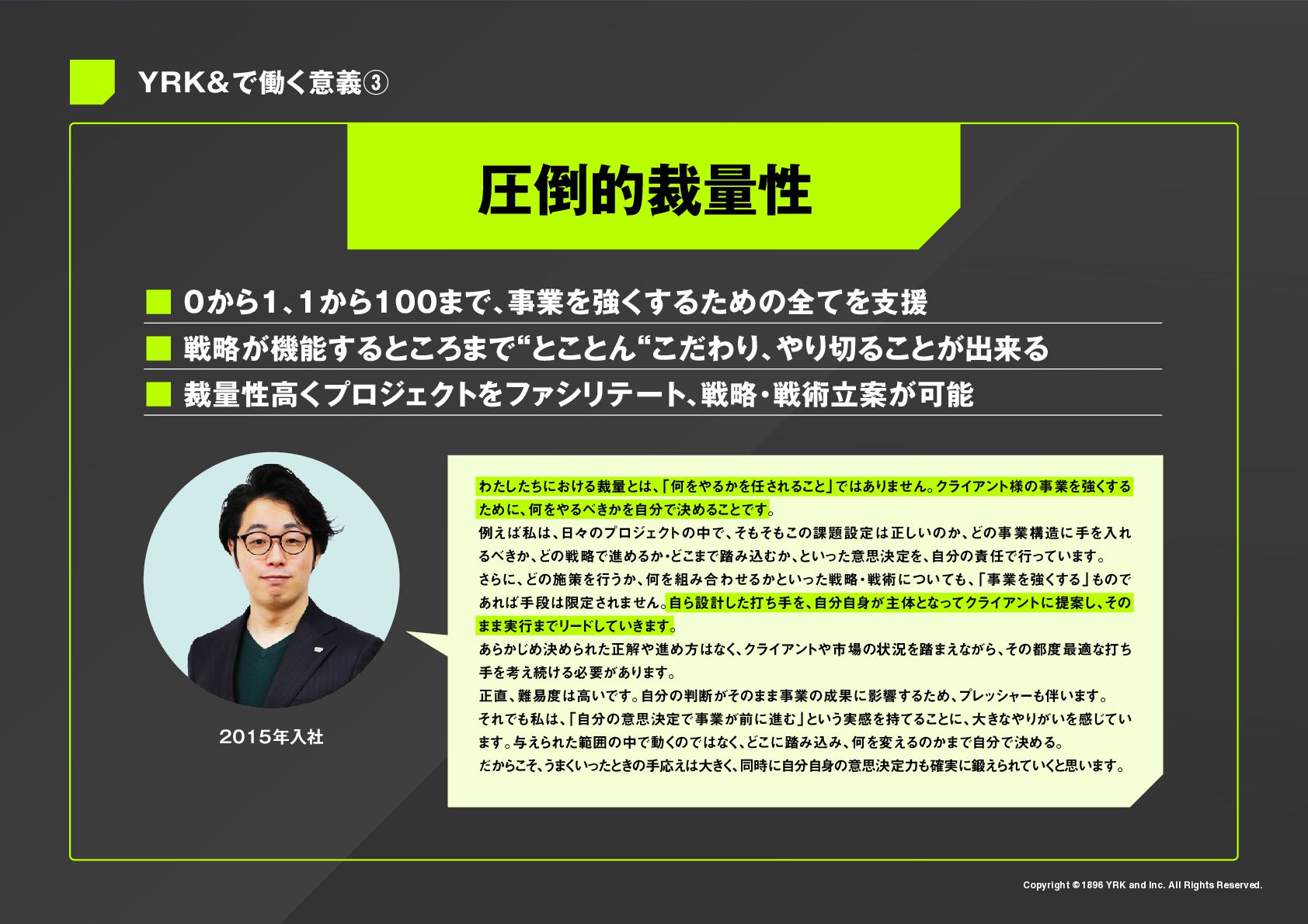 ɾ ઓज़ཱҊ͕Մೳ Θͨͨͪ͠ʹ͓͚Δࡋྔͱ͸ɺ ʮԿΛ΍Δ͔Λ೚͞ΕΔ͜ ͱʯ Ͱ͸͋Γ·ͤΜɻ ΫϥΠΞϯ τ༷ͷࣄۀΛڧ͘ ͢Δ ͨΊʹɺ ԿΛ΍Δ΂͖͔Λࣗ෼ͰܾΊΔ͜ ͱͰ͢ɻ ྫ͑͹ࢲ͸ɺ ೔ʑͷϓϩδΣΫ τͷதͰɺ ͦ΋ͦ΋͜ͷ՝୊ઃఆ͸ਖ਼͍͠ͷ͔ɺ Ͳͷࣄۀߏ଄ʹखΛೖΕ Δ΂͖͔ɺ ͲͷઓུͰਐΊΔ͔ ɾ Ͳ ͜ ·Ͱ౿ΈࠐΉ͔ɺ ͱ͍ͬͨҙࢥܾఆΛɺ ࣗ෼ͷ੹೚Ͱߦ͍ͬͯ·͢ɻ ͞Βʹɺ ͲͷࢪࡦΛߦ͏͔ɺ ԿΛ૊Έ߹ΘͤΔ͔ͱ͍ͬͨઓུ ɾ ઓज़ʹ͍ͭͯ΋ɺ ʮࣄۀΛڧ͘ ͢Δʯ ΋ͷͰ ͋Ε͹खஈ͸ݶఆ͞Ε·ͤΜɻ ࣗΒઃܭͨ͠ଧͪखΛɺ ࣗ෼ࣗ਎͕ओମͱͳͬͯΫϥΠΞϯ τʹఏҊ͠ɺ ͦͷ ··࣮ߦ·ͰϦʔ υ͍͖ͯ͠·͢ɻ ͋Β͔͡ΊܾΊΒΕͨਖ਼ղ΍ਐΊํ͸ͳ ͘ ɺ ΫϥΠΞϯ τ΍ࢢ৔ͷঢ়گΛ౿·͑ͳ͕Βɺ ͦͷ౎౓࠷దͳଧͪ खΛߟ͑ଓ͚Δඞཁ͕͋Γ·͢ɻ ਖ਼௚ɺ ೉қ౓͸ߴ͍Ͱ͢ɻ ࣗ෼ͷ൑அ͕ͦͷ··ࣄۀͷ੒ՌʹӨڹ͢ΔͨΊɺ ϓϨογϟʔ΋൐͍·͢ɻ ͦΕͰ΋ࢲ͸ɺ ʮࣗ෼ͷҙࢥܾఆͰࣄۀ͕લʹਐΉʯ ͱ͍͏࣮ײΛ࣋ͯΔ͜ ͱʹɺ େ͖ͳ΍Γ͕͍Λײ͍ͯ͡ ·͢ɻ ༩͑ΒΕͨൣғͷதͰಈ͘ ͷͰ͸ͳ ͘ ɺ Ͳ ͜ʹ౿ΈࠐΈɺ ԿΛม͑Δͷ͔·Ͱࣗ෼ͰܾΊΔɻ ͔ͩΒ ͜ ͦɺ ͏ · ͘ ͍ͬ ͨ ͱ ͖ͷखԠ͑͸େ͖ ͘ ɺ ಉ࣌ʹࣗ෼ࣗ਎ͷҙࢥܾఆྗ΋࣮֬ʹ஁͑ Β Ε͍ͯ ͘ ͱࢥ͍·͢ɻ :3,Ͱಇ͘ҙٛᶅ Copyright © 1896 YRK and Inc. All Rights Reserved. ೥ೖࣾ
