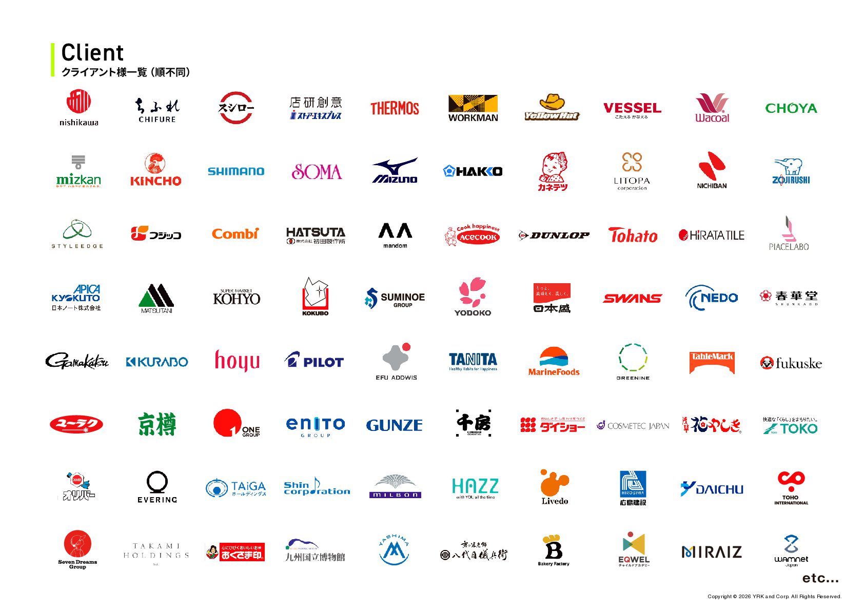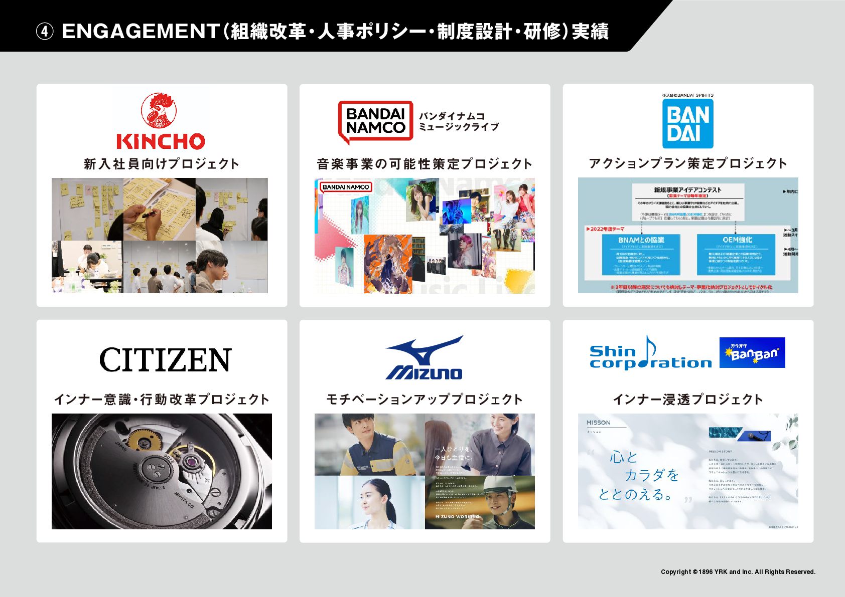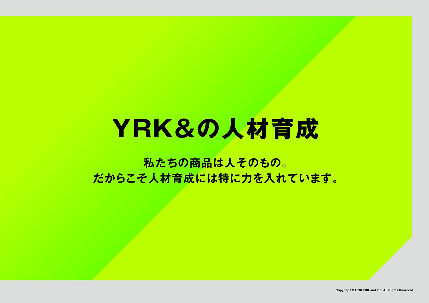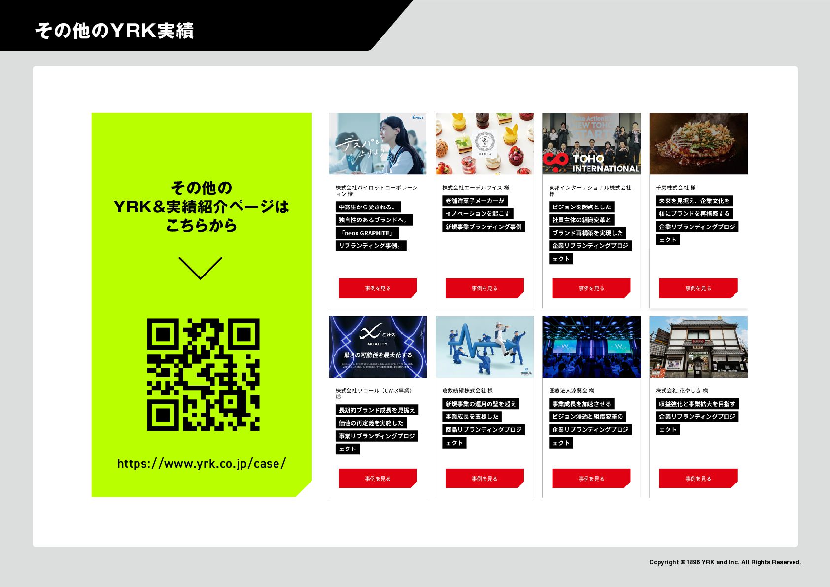 © 1896 YRK and Inc. All Rights Reserved. ᶆ&/("(&.&/5 ʢ૊৫ڧԽʣ ࣮੷ มֵࢧԉ ίϯαϧςΟ ϯάࢧԉ ίϛ ϡχέʔγ ϣ ϯσβΠϯࢧԉ ΞΫςΟϕʔγ ϣ ϯࢧԉ ఻ୡࢧԉ ܧଓ੒௕ࢧԉ ˙ଘࡏՁ஋ͷ࠶ఆٛ ˙Ϗδϣϯɺ ϛογϣϯɺ ߦಈࢦ਑ࡦఆ ˙ࣄۀ֦ுઓུઃܭ ˙Πϯφʔਁಁઓུ ɾ ઓज़ࡦఆ ˙νʔϜϏϧυ ɾ ΠϯφʔϞνϕʔγϣϯσβΠϯ ˙ݕূ߲໨ɺ ,(*ʗ,1*ઃܭ ˙ސ٬ମݧͷϦϒϥϯσΟϯά ˙ϗʔϧσΟϯάεγϯϘϧϚʔΫσβΠϯ ˙ΩϟϥΫλʔσβΠϯ੍࡞ ˙)1࡮৽ɺ ಈը੍࡞ ˙֤छΠϯφʔπʔϧσβΠϯ ᵋ໊ࢗɺ นࢴɺ ෧౵ɺ ϢχϑΥʔϜͳͲ ˙֤छΞ΢λʔπʔϧσβΠϯ ᵋ਍࡯݊ɺ ٹٸं ɾ ֤छं྆ϥοϐϯάɺ ͳͲ ˙ΠϯφʔਁಁΠϕϯτͷઃܭ ɾ ࣮ࢪ ˙σδϚϩʔυϚοϓઃܭ ɾ ࣮ࢪ ɾ ӡӦࢧԉ ˙&$αΠ τϩʔϯν ɾ ӡӦ ɾ ӡ༻ ˙ඒ༰ࣄۀ޿ࠂӡӦ ɾ ӡ༻ࢧԉ ˙7."ೝ஌ ɾ ਁಁ ɾ ࣮ߦϓϩδΣΫτࢧԉ ᵋάοζചΓୂ ᵋΩϟϥΫλʔ͹Β·͖ୂ ᵋֶߍ࡞Γୂ ࣄۀίϯαϧςΟϯά ΫϥΠΞϯτͷࣄۀͦͷ΋ͷΛɺ ΋ͬͱڧ͘ɺ ΋ͬͱ࣋ଓՄೳͳܗ΁