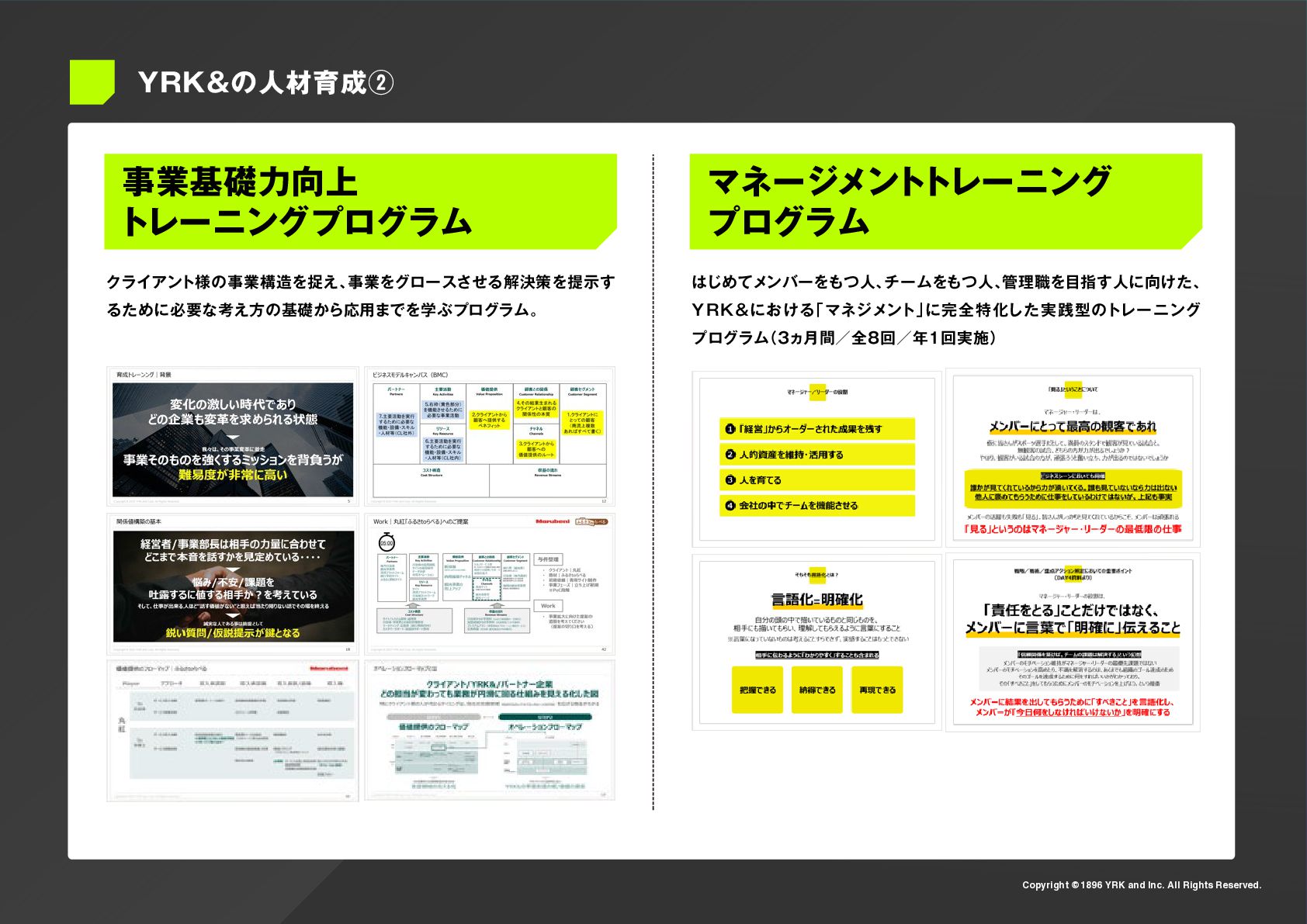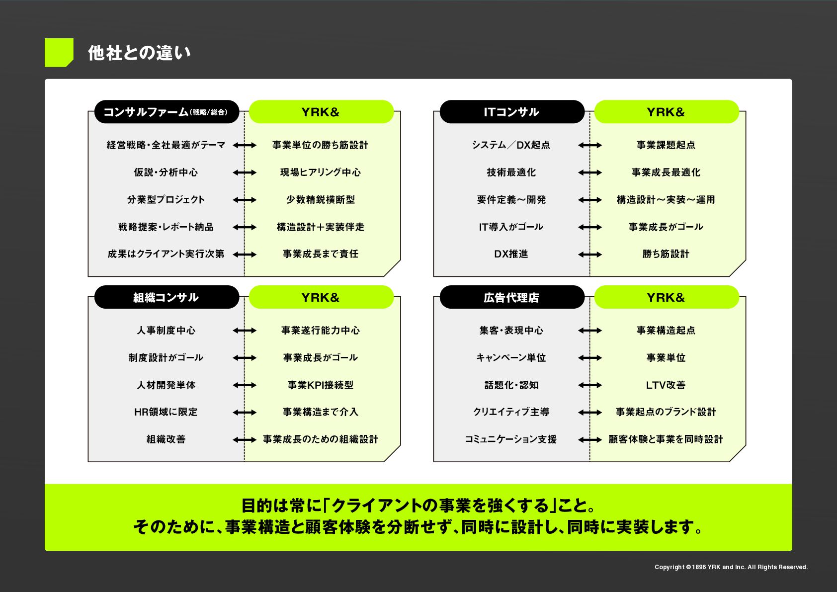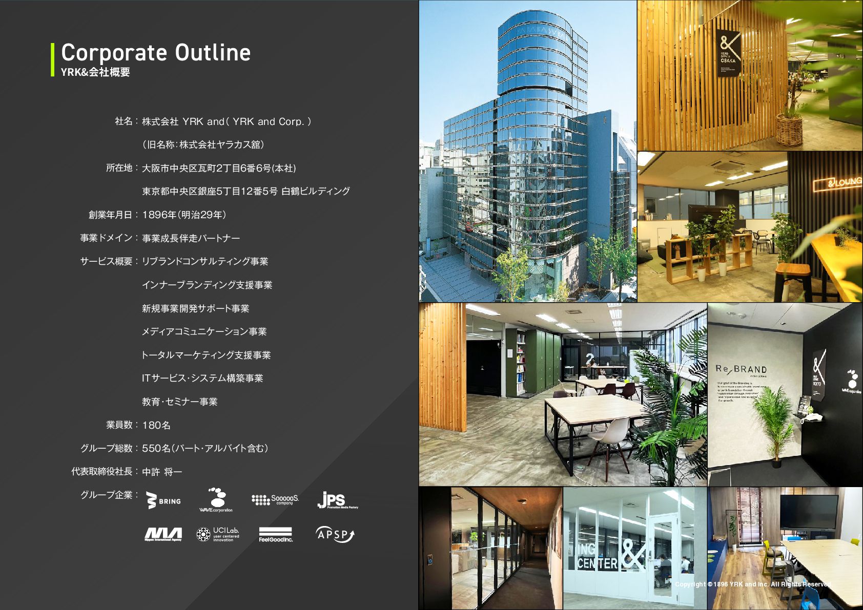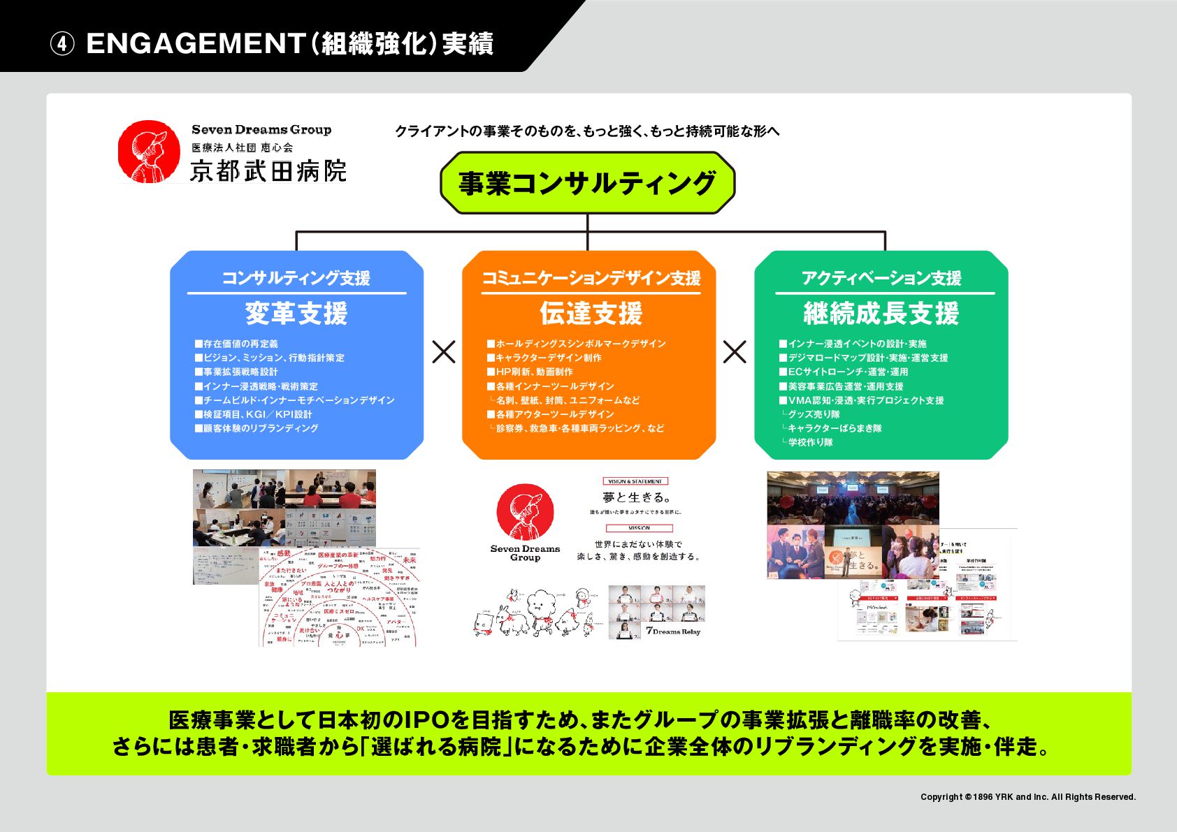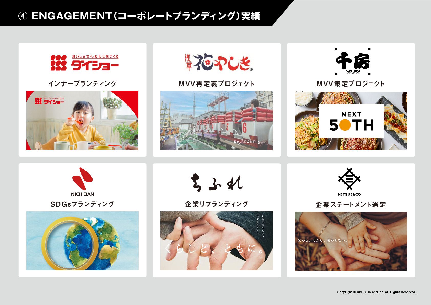 © 1896 YRK and Inc. All Rights Reserved. ᶆ&/("(&.&/5 ʢ૊৫ڧԽʣ ࣮੷ มֵࢧԉ ίϯαϧςΟ ϯάࢧԉ ίϛ ϡχέʔγ ϣ ϯσβΠϯࢧԉ ΞΫςΟϕʔγ ϣ ϯࢧԉ ఻ୡࢧԉ ܧଓ੒௕ࢧԉ ˙ଘࡏՁ஋ͷ࠶ఆٛ ˙Ϗδϣϯɺ ϛογϣϯɺ ߦಈࢦ਑ࡦఆ ˙ࣄۀ֦ுઓུઃܭ ˙Πϯφʔਁಁઓུ ɾ ઓज़ࡦఆ ˙νʔϜϏϧυ ɾ ΠϯφʔϞνϕʔγϣϯσβΠϯ ˙ݕূ߲໨ɺ ,(*ʗ,1*ઃܭ ˙ސ٬ମݧͷϦϒϥϯσΟϯά ˙ϗʔϧσΟϯάεγϯϘϧϚʔΫσβΠϯ ˙ΩϟϥΫλʔσβΠϯ੍࡞ ˙)1࡮৽ɺ ಈը੍࡞ ˙֤छΠϯφʔπʔϧσβΠϯ ᵋ໊ࢗɺ นࢴɺ ෧౵ɺ ϢχϑΥʔϜͳͲ ˙֤छΞ΢λʔπʔϧσβΠϯ ᵋ਍࡯݊ɺ ٹٸं ɾ ֤छं྆ϥοϐϯάɺ ͳͲ ˙ΠϯφʔਁಁΠϕϯτͷઃܭ ɾ ࣮ࢪ ˙σδϚϩʔυϚοϓઃܭ ɾ ࣮ࢪ ɾ ӡӦࢧԉ ˙&$αΠ τϩʔϯν ɾ ӡӦ ɾ ӡ༻ ˙ඒ༰ࣄۀ޿ࠂӡӦ ɾ ӡ༻ࢧԉ ˙7."ೝ஌ ɾ ਁಁ ɾ ࣮ߦϓϩδΣΫτࢧԉ ᵋάοζചΓୂ ᵋΩϟϥΫλʔ͹Β·͖ୂ ᵋֶߍ࡞Γୂ ࣄۀίϯαϧςΟϯά ΫϥΠΞϯτͷࣄۀͦͷ΋ͷΛɺ ΋ͬͱڧ͘ɺ ΋ͬͱ࣋ଓՄೳͳܗ΁