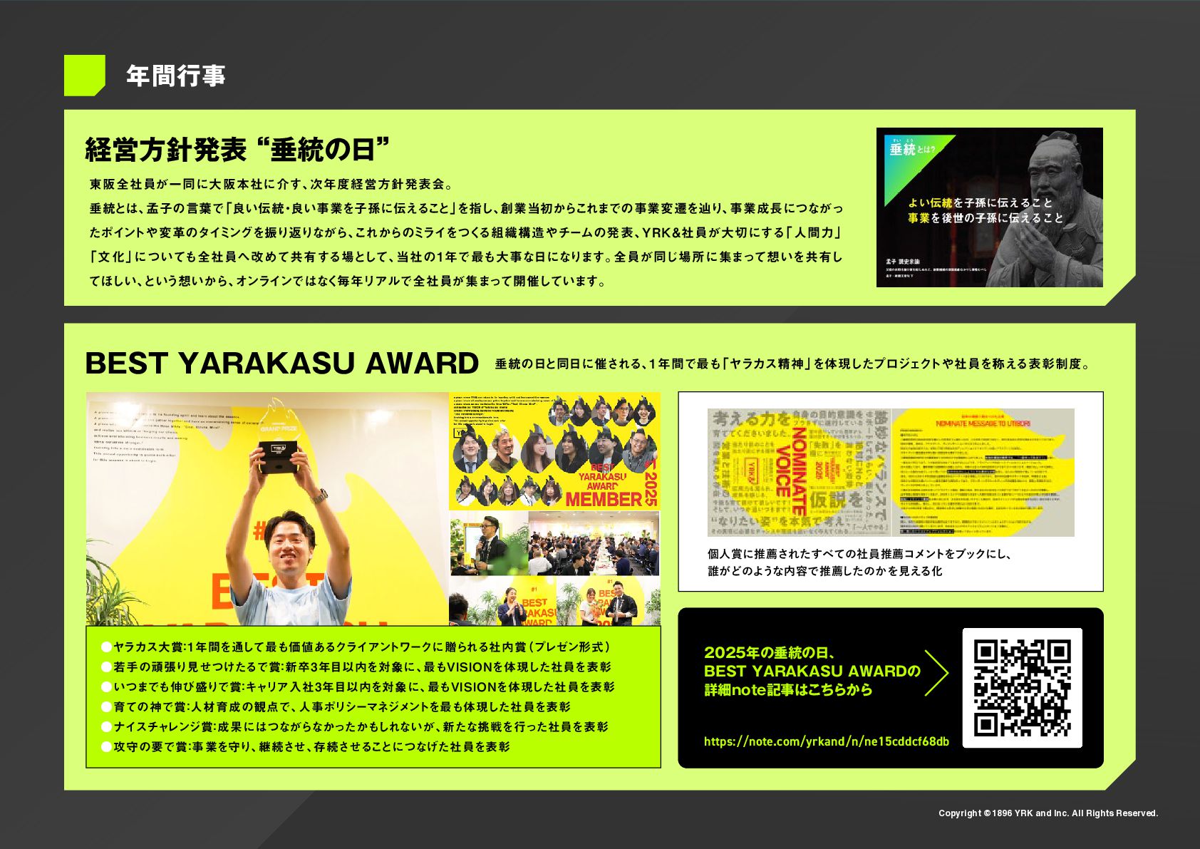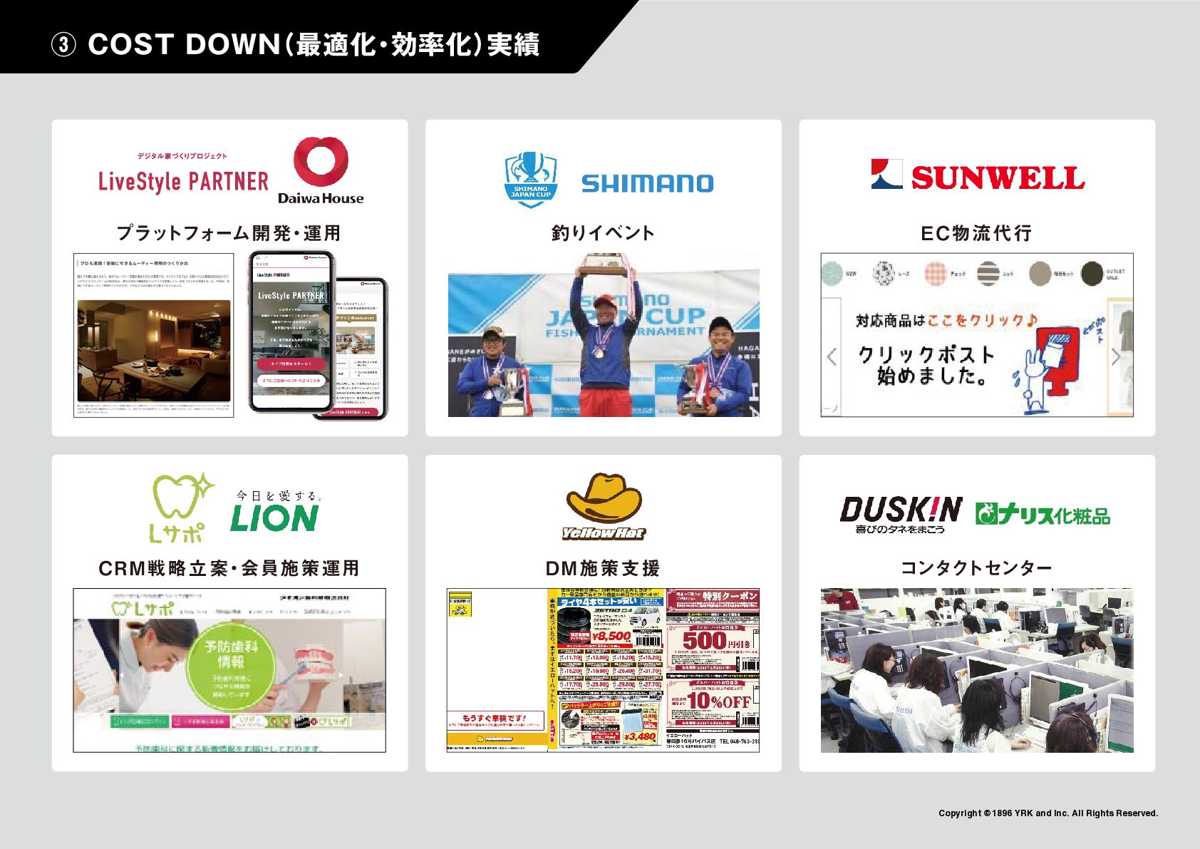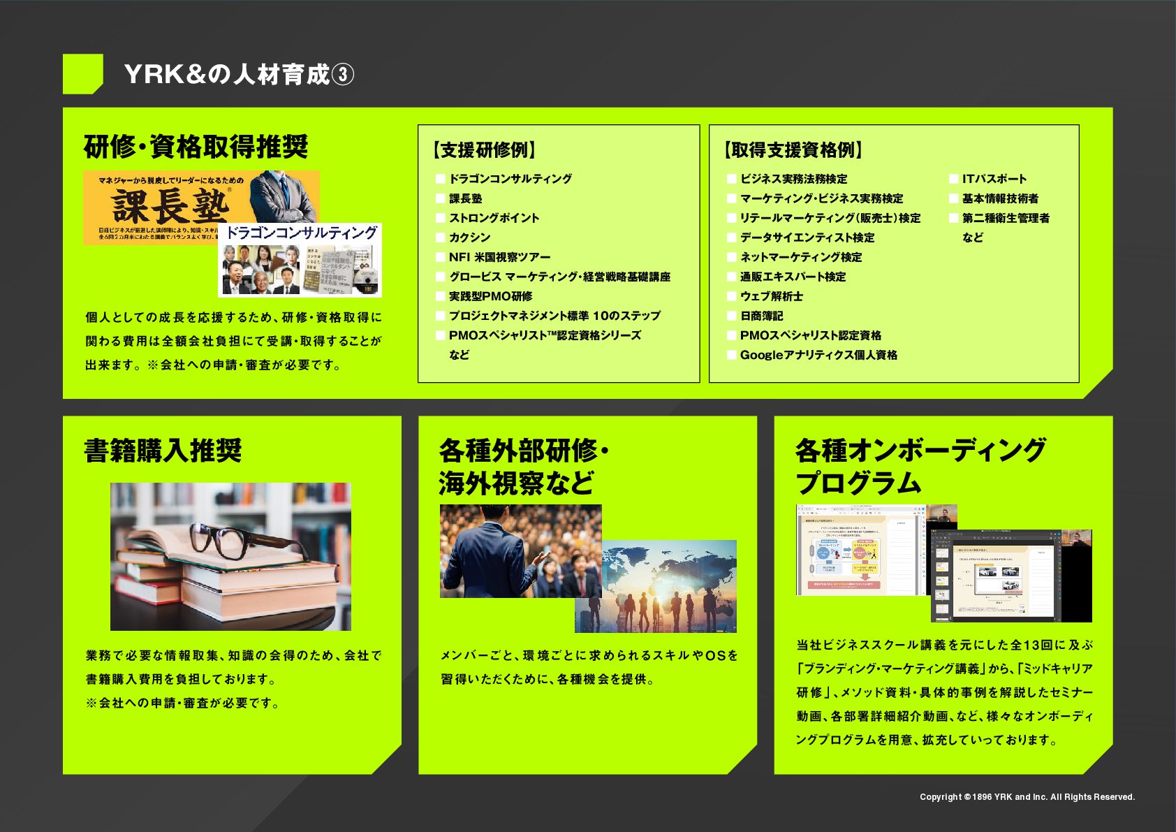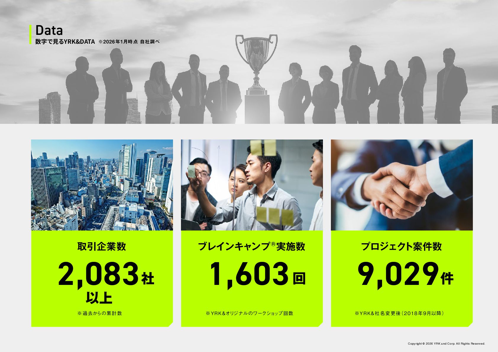© 1896 YRK and Inc. All Rights Reserved. ᶆ&/("(&.&/5 ʢ૊৫ڧԽʣ ࣮੷ มֵࢧԉ ίϯαϧςΟ ϯάࢧԉ ίϛ ϡχέʔγ ϣ ϯσβΠϯࢧԉ ΞΫςΟϕʔγ ϣ ϯࢧԉ ఻ୡࢧԉ ܧଓ੒௕ࢧԉ ˙ଘࡏՁ஋ͷ࠶ఆٛ ˙Ϗδϣϯɺ ϛογϣϯɺ ߦಈࢦ਑ࡦఆ ˙ࣄۀ֦ுઓུઃܭ ˙Πϯφʔਁಁઓུ ɾ ઓज़ࡦఆ ˙νʔϜϏϧυ ɾ ΠϯφʔϞνϕʔγϣϯσβΠϯ ˙ݕূ߲໨ɺ ,(*ʗ,1*ઃܭ ˙ސ٬ମݧͷϦϒϥϯσΟϯά ˙ϗʔϧσΟϯάεγϯϘϧϚʔΫσβΠϯ ˙ΩϟϥΫλʔσβΠϯ੍࡞ ˙)1࡮৽ɺ ಈը੍࡞ ˙֤छΠϯφʔπʔϧσβΠϯ ᵋ໊ࢗɺ นࢴɺ ෧౵ɺ ϢχϑΥʔϜͳͲ ˙֤छΞ΢λʔπʔϧσβΠϯ ᵋ਍࡯݊ɺ ٹٸं ɾ ֤छं྆ϥοϐϯάɺ ͳͲ ˙ΠϯφʔਁಁΠϕϯτͷઃܭ ɾ ࣮ࢪ ˙σδϚϩʔυϚοϓઃܭ ɾ ࣮ࢪ ɾ ӡӦࢧԉ ˙&$αΠ τϩʔϯν ɾ ӡӦ ɾ ӡ༻ ˙ඒ༰ࣄۀ޿ࠂӡӦ ɾ ӡ༻ࢧԉ ˙7."ೝ஌ ɾ ਁಁ ɾ ࣮ߦϓϩδΣΫτࢧԉ ᵋάοζചΓୂ ᵋΩϟϥΫλʔ͹Β·͖ୂ ᵋֶߍ࡞Γୂ ࣄۀίϯαϧςΟϯά ΫϥΠΞϯτͷࣄۀͦͷ΋ͷΛɺ ΋ͬͱڧ͘ɺ ΋ͬͱ࣋ଓՄೳͳܗ΁