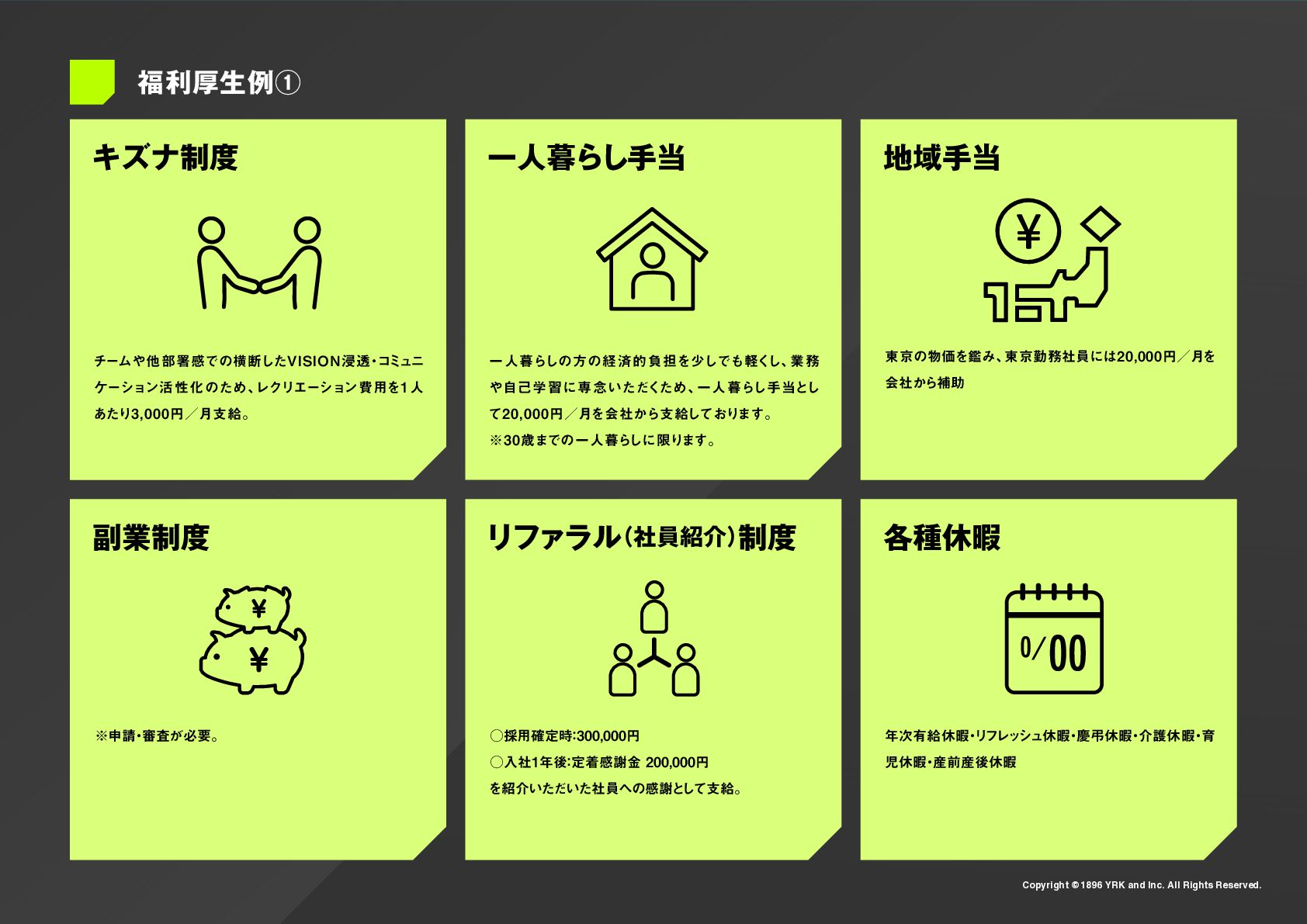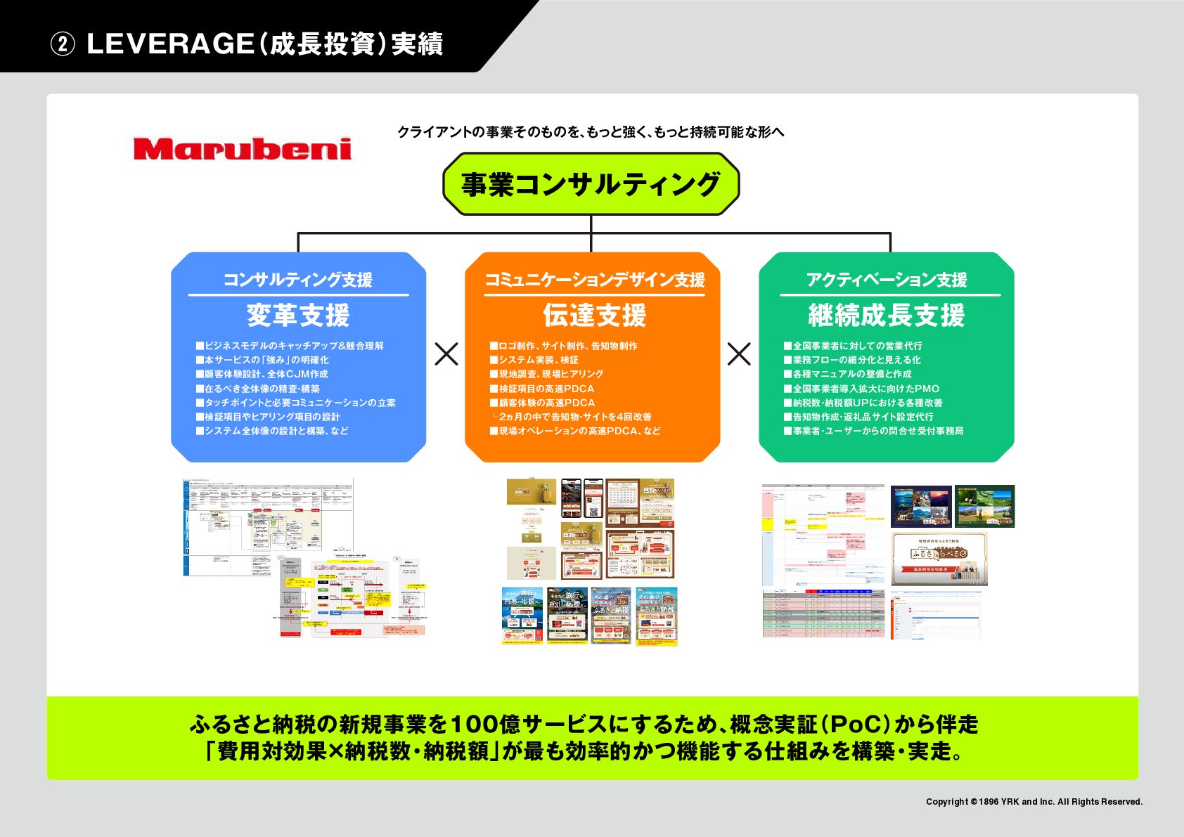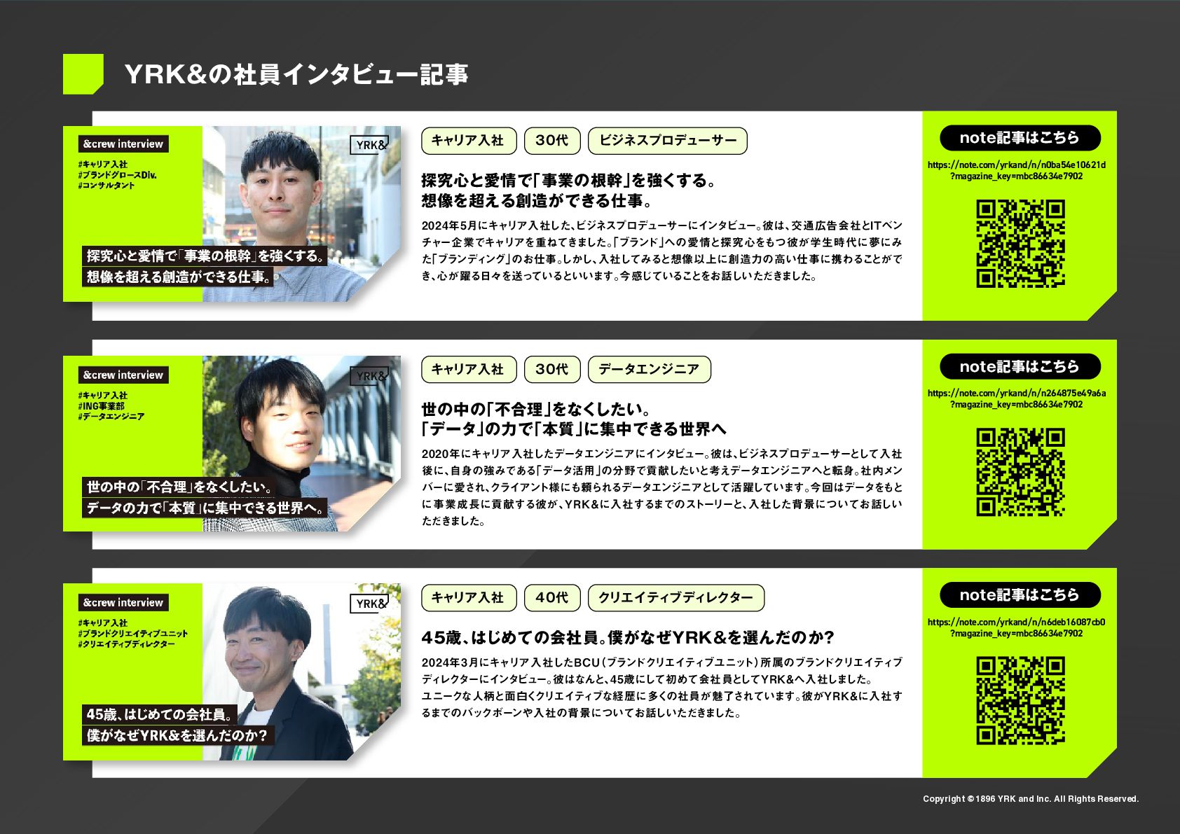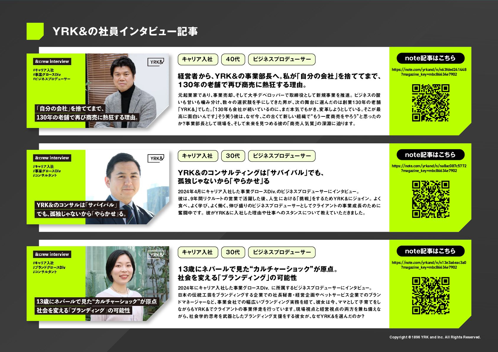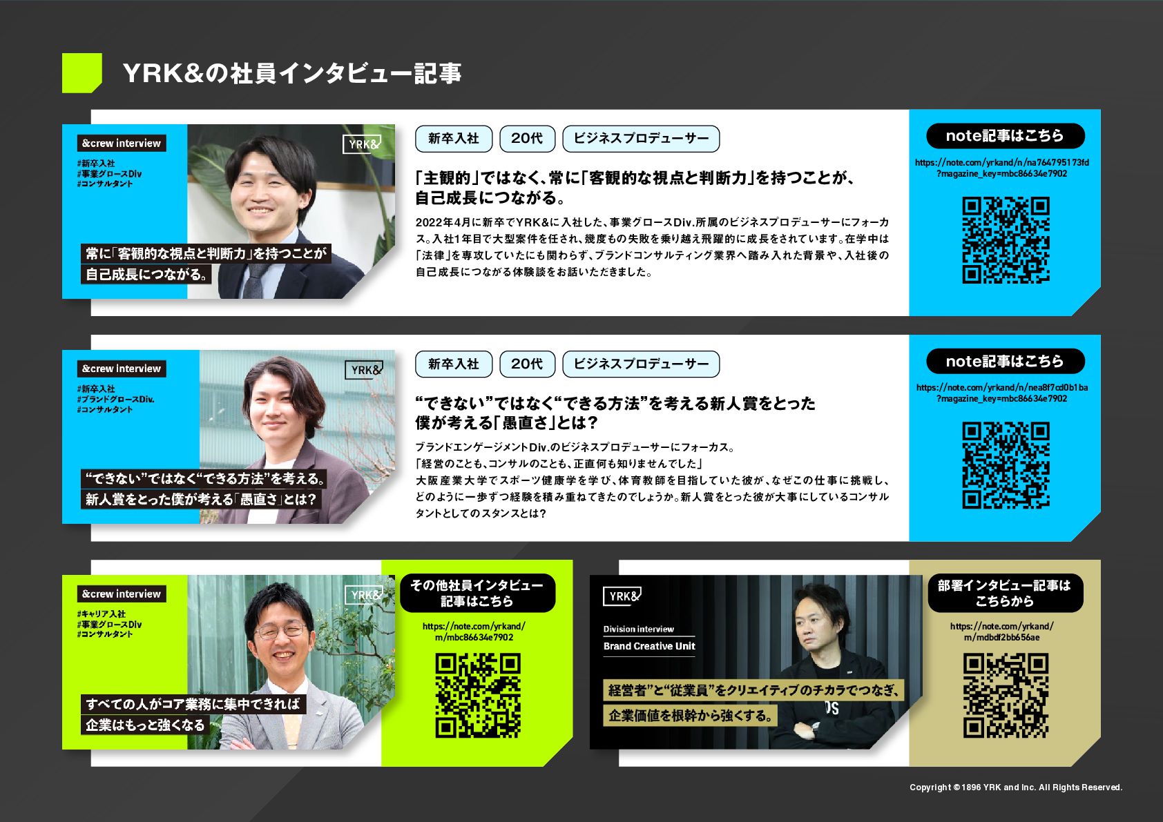 © 1896 YRK and Inc. All Rights Reserved. ᶆ&/("(&.&/5 ʢ૊৫ڧԽʣ ࣮੷ มֵࢧԉ ίϯαϧςΟ ϯάࢧԉ ίϛ ϡχέʔγ ϣ ϯσβΠϯࢧԉ ΞΫςΟϕʔγ ϣ ϯࢧԉ ఻ୡࢧԉ ܧଓ੒௕ࢧԉ ˙ଘࡏՁ஋ͷ࠶ఆٛ ˙Ϗδϣϯɺ ϛογϣϯɺ ߦಈࢦ਑ࡦఆ ˙ࣄۀ֦ுઓུઃܭ ˙Πϯφʔਁಁઓུ ɾ ઓज़ࡦఆ ˙νʔϜϏϧυ ɾ ΠϯφʔϞνϕʔγϣϯσβΠϯ ˙ݕূ߲໨ɺ ,(*ʗ,1*ઃܭ ˙ސ٬ମݧͷϦϒϥϯσΟϯά ˙ϗʔϧσΟϯάεγϯϘϧϚʔΫσβΠϯ ˙ΩϟϥΫλʔσβΠϯ੍࡞ ˙)1࡮৽ɺ ಈը੍࡞ ˙֤छΠϯφʔπʔϧσβΠϯ ᵋ໊ࢗɺ นࢴɺ ෧౵ɺ ϢχϑΥʔϜͳͲ ˙֤छΞ΢λʔπʔϧσβΠϯ ᵋ਍࡯݊ɺ ٹٸं ɾ ֤छं྆ϥοϐϯάɺ ͳͲ ˙ΠϯφʔਁಁΠϕϯτͷઃܭ ɾ ࣮ࢪ ˙σδϚϩʔυϚοϓઃܭ ɾ ࣮ࢪ ɾ ӡӦࢧԉ ˙&$αΠ τϩʔϯν ɾ ӡӦ ɾ ӡ༻ ˙ඒ༰ࣄۀ޿ࠂӡӦ ɾ ӡ༻ࢧԉ ˙7."ೝ஌ ɾ ਁಁ ɾ ࣮ߦϓϩδΣΫτࢧԉ ᵋάοζചΓୂ ᵋΩϟϥΫλʔ͹Β·͖ୂ ᵋֶߍ࡞Γୂ ࣄۀίϯαϧςΟϯά ΫϥΠΞϯτͷࣄۀͦͷ΋ͷΛɺ ΋ͬͱڧ͘ɺ ΋ͬͱ࣋ଓՄೳͳܗ΁