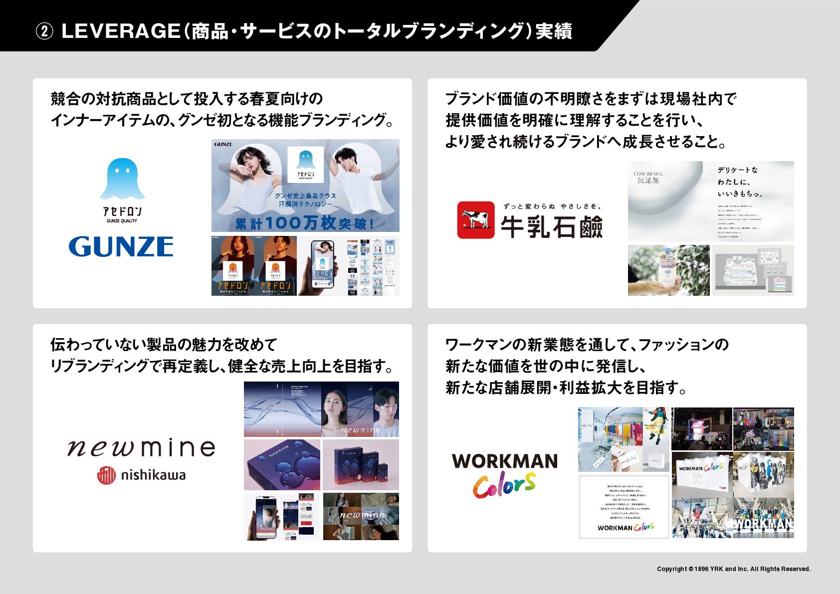 Δػೳϒϥ ϯσΟ ϯ άɻ ϒϥϯ υՁ஋ͷෆ໌ྎ͞ Λ·ͣ͸ݱ৔ࣾ಺Ͱ ఏڙՁ஋Λ໌֬ʹཧղ͢Δ ͜ ͱ Λߦ͍ɺ Α ΓѪ͞Εଓ͚Δϒϥϯ υ΁੒௕ͤ͞Δ ͜ ͱɻ ఻Θͬ ͍ͯͳ͍੡඼ͷັྗΛվΊͯ Ϧ ϒϥ ϯσΟ ϯ άͰ࠶ఆٛ͠ɺ ݈શͳച্޲্Λ ໨ࢦ͢ɻ ϫʔΫϚϯͷ৽ۀଶΛ௨ͯ͠ɺ ϑ Ν ο γ ϣ ϯͷ ৽ͨͳՁ஋Λੈͷதʹൃ৴͠ɺ ৽ͨͳళฮల։ ɾ རӹ֦େΛ໨ࢦ͢ɻ Copyright © 1896 YRK and Inc. All Rights Reserved. ᶄ-&7&3"(& ʢ঎඼ ɾ αʔϏεͷτʔλϧϒϥϯσΟϯάʣ ࣮੷