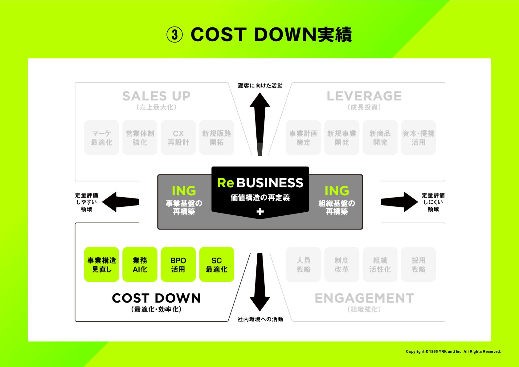 ʢ੒௕౤ࢿʣ SALES UP ʢച্࠷େԽʣ ސ٬ʹ޲͚ͨ׆ಈ ࣾ಺؀ڥ΁ͷ׆ಈ ఆྔධՁ ͠΍͍͢ ྖҬ ఆྔධՁ ͠ʹ͘ ͍ ྖҬ Ձ஋ߏ଄ͷ࠶ఆٛ ReBUSINESS + ࣄۀج൫ͷ ࠶ߏங ૊৫ج൫ͷ ࠶ߏங ING ING ENGAGEMENT ʢ૊৫ڧԽʣ COST DOWN ʢ࠷దԽ ɾ ޮ཰Խʣ Ϛʔέ ࠷దԽ Ӧۀମ੍ ڧԽ $9 ࠶ઃܭ ৽نൢ࿏ ։୓ ࣄۀܭը ࡦఆ ৽نࣄۀ ։ൃ ৽঎඼ ։ൃ ࢿຊ ɾ ఏܞ ׆༻ ਓһ ઓུ ੍౓ վֵ ૊৫ ׆ੑԽ ࠾༻ ઓུ ࣄۀߏ଄ ݟ௚͠ ۀ຿ "*Խ #10 ׆༻ 4$ ࠷దԽ ᶄ-&7&3"(&࣮੷