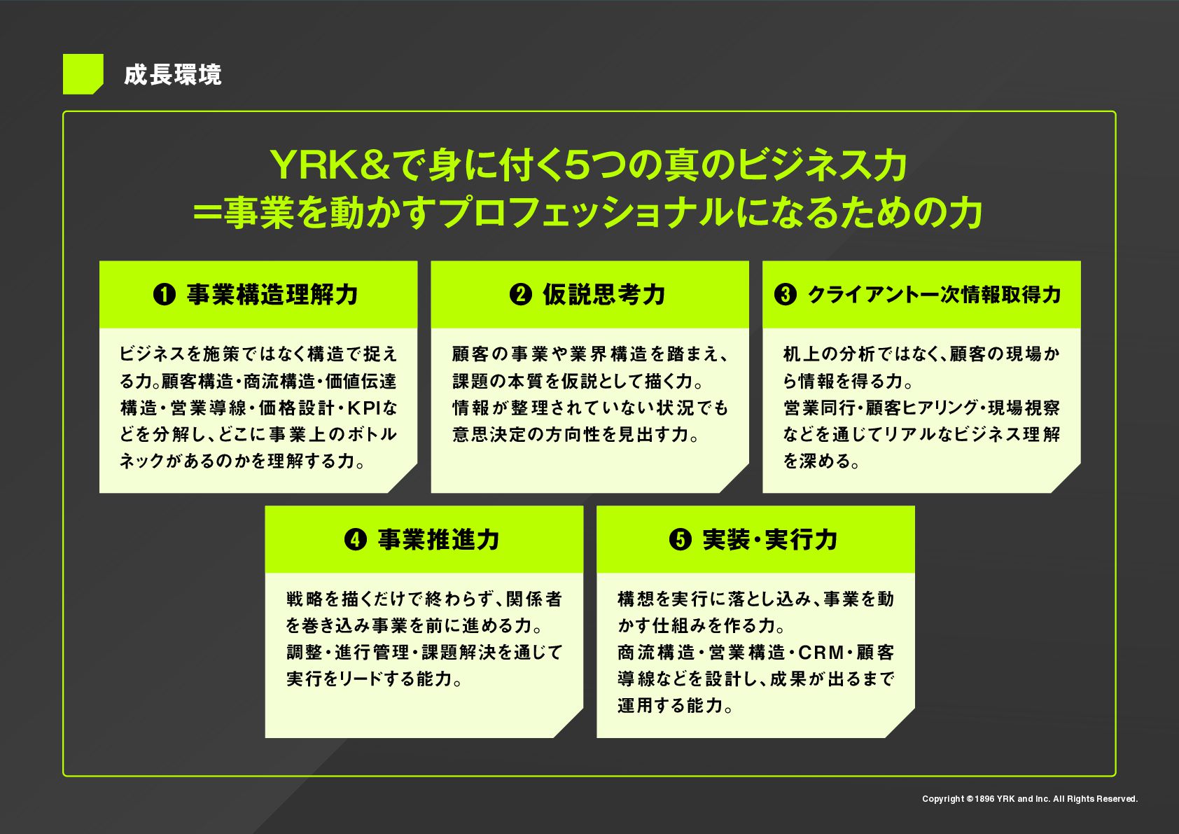 7. ࣄۀͷউͪےΛ࠶ઃܭ͠ɺ ߏ଄Λ૊Έସ͑ɺ ࣮૷͠ɺ ੒Ռ͕ग़Δ·Ͱ౿ΈࠐΉ ΫϥΠΞϯτͱಉ౳ɺ ΋͘͠͸ͦΕҎ্ʹΫϥΠΞϯτࣄۀͷ͜ͱΛߟ͑Δɺ Our Business YRK&は何の会社か? Copyright