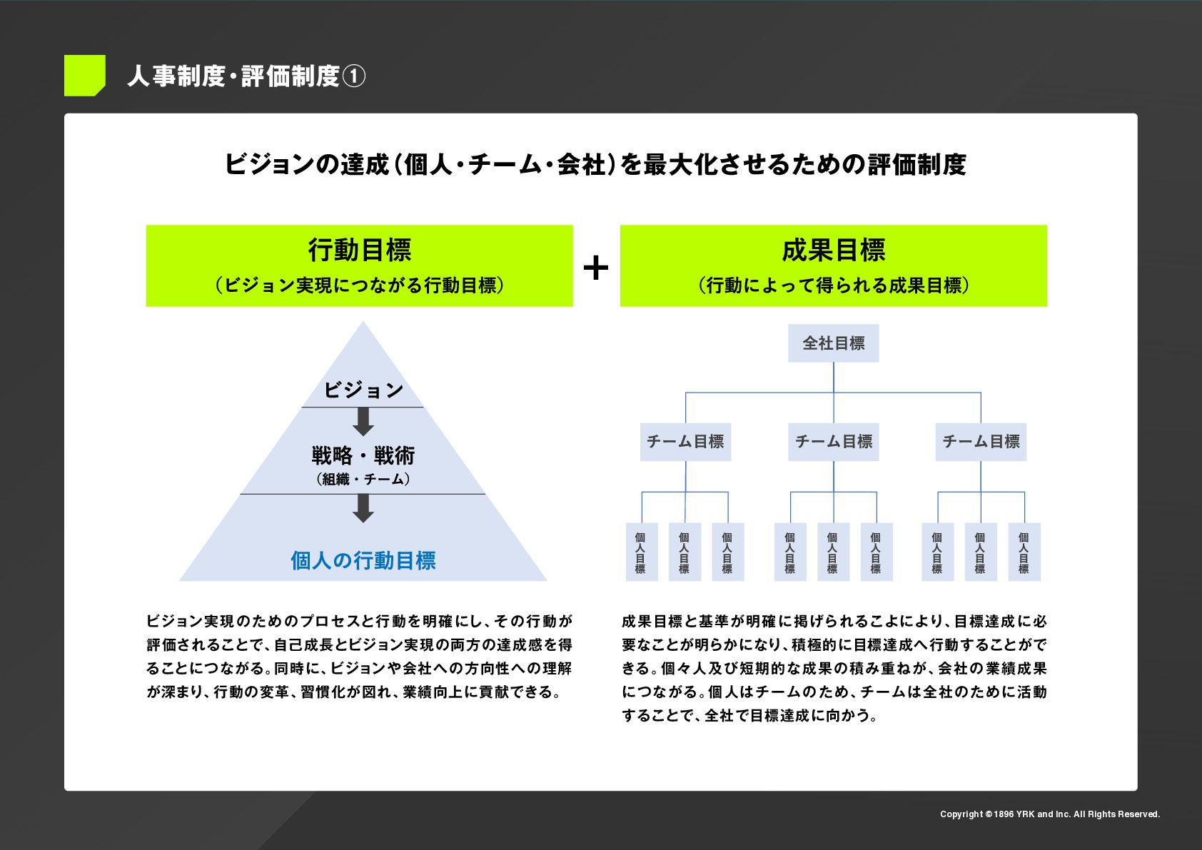 ʢݸਓ ɾ νʔϜ ɾ ձࣾʣ Λ࠷େԽͤ͞ΔͨΊͷධՁ੍౓ ʴ ਓࣄ੍౓ ɾ ධՁ੍౓ᶃ Ϗδϣϯ࣮ݱͷͨΊͷϓϩηεͱߦಈΛ໌֬ʹ͠ɺ ͦͷߦಈ͕ ධՁ͞ΕΔ͜ͱͰɺ ࣗݾ੒௕ͱϏδϣϯ࣮ݱͷ྆ํͷୡ੒ײΛಘ Δ͜ͱʹͭͳ͕Δɻ ಉ࣌ʹɺ Ϗδϣϯ΍ձࣾ΁ͷํ޲ੑ΁ͷཧղ ͕ਂ·Γɺ ߦಈͷมֵɺ श׳Խ͕ਤΕɺ ۀ੷޲্ʹߩݙͰ͖Δɻ ੒Ռ໨ඪͱج४͕໌֬ʹܝ͛ΒΕΔ͜ΑʹΑΓɺ ໨ඪୡ੒ʹඞ ཁͳ͜ͱ͕໌Β͔ʹͳΓɺ ੵۃతʹ໨ඪୡ੒΁ߦಈ͢Δ͜ͱ͕Ͱ ͖Δɻ ݸʑਓٴͼ୹ظతͳ੒ՌͷੵΈॏͶ͕ɺ ձࣾͷۀ੷੒Ռ ʹͭͳ͕Δɻ ݸਓ͸νʔϜͷͨΊɺ νʔϜ͸શࣾͷͨΊʹ׆ಈ ͢Δ͜ͱͰɺ શࣾͰ໨ඪୡ੒ʹ޲͔͏ɻ