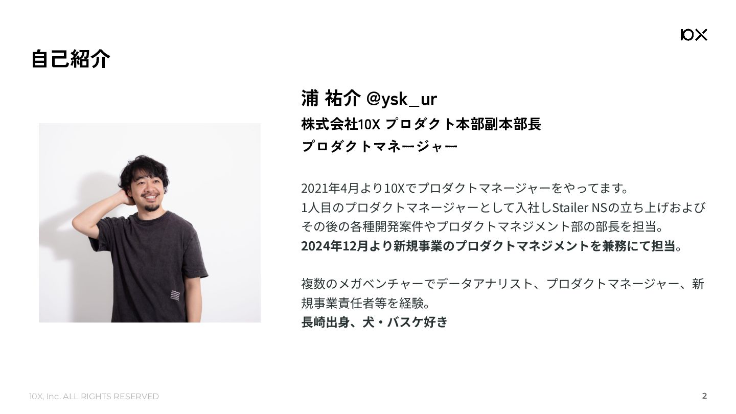 プロダクト本部副本部長 プロダクトマネージャー 2021年4⽉より10Xでプロダクトマネージャーをやってます。 1⼈⽬のプロダクトマネージャーとして⼊社しStailer NSの⽴ち上げおよび その後の各種開発案件やプロダクトマネジメント部の部⻑を担当。 2024年12⽉より新規事業のプロダクトマネジメントを兼務にて担当。 複数のメガベンチャーでデータアナリスト、プロダクトマネージャー、新 規事業責任者等を経験。 ⻑崎出⾝、⽝‧バスケ好き 2