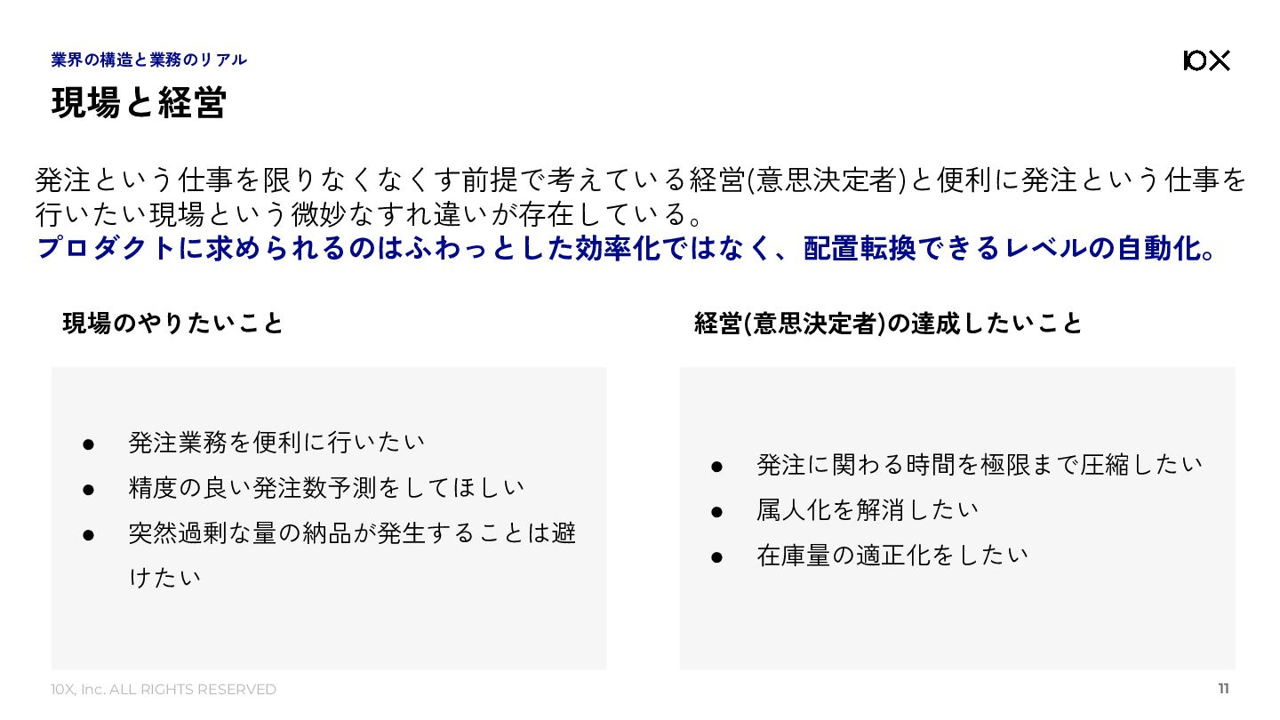 8. 10X, Inc. ALL RIGHTS RESERVED 11 業界の構造と業務のリアル 現場と経営 • 発注に関わる時間を極限まで圧縮したい